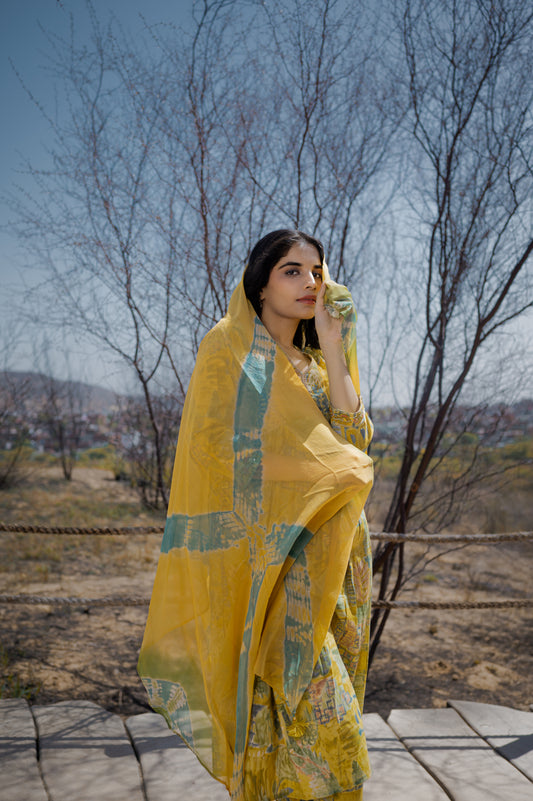 Earthy Green Abstract Print Kurta Pant With Dupatta