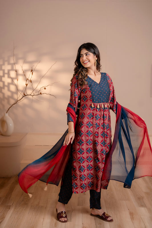 Wine Overlap Yoke Kurta pant Dupatta Set