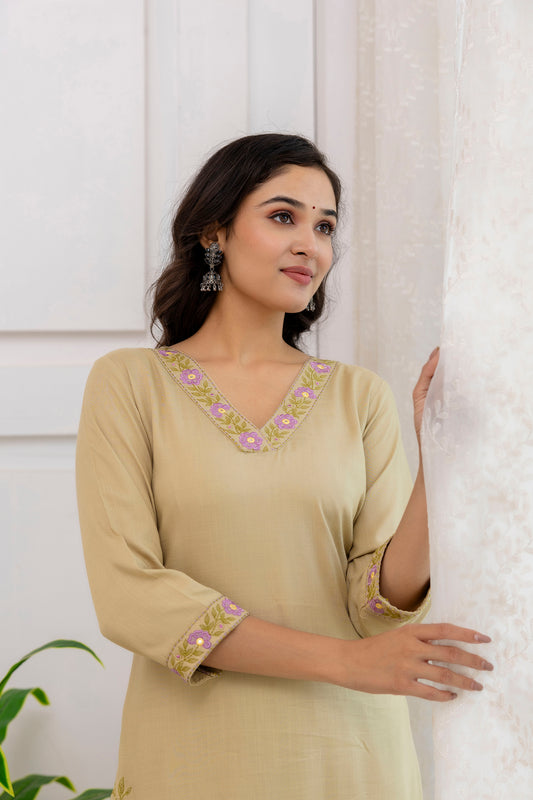 Olive Green Handloom Cotton Zari Sequins Embroidered Kurta Pant