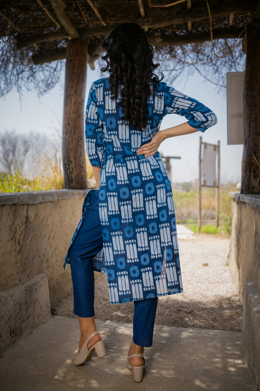 Indigo Blue Dabu Geometric Print Kurta Pant Set
