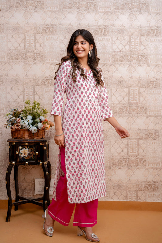 White and Pink Cotton Printed Kurta Set