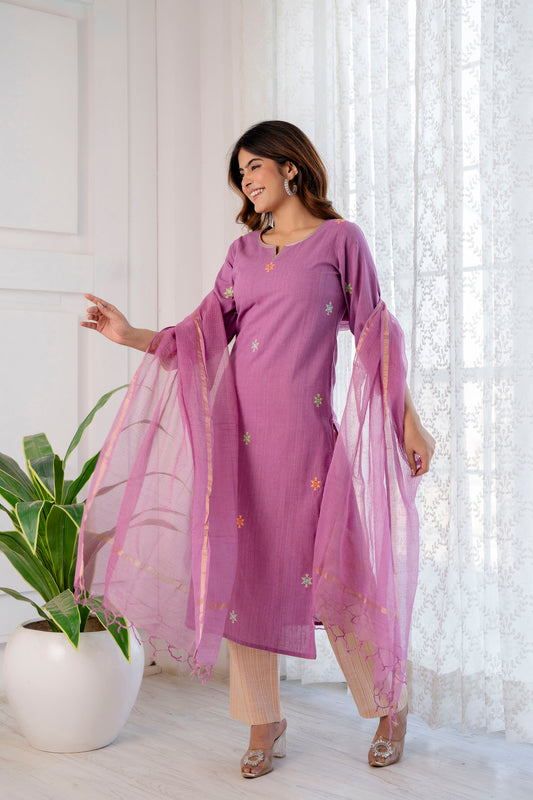 Lilac Handloom Embroidered Kurta Pant Set With Doria Dupatta