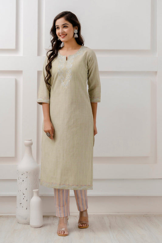 Olive Green Handloom Cotton Zari Sequins Embroidered Kurta Pant