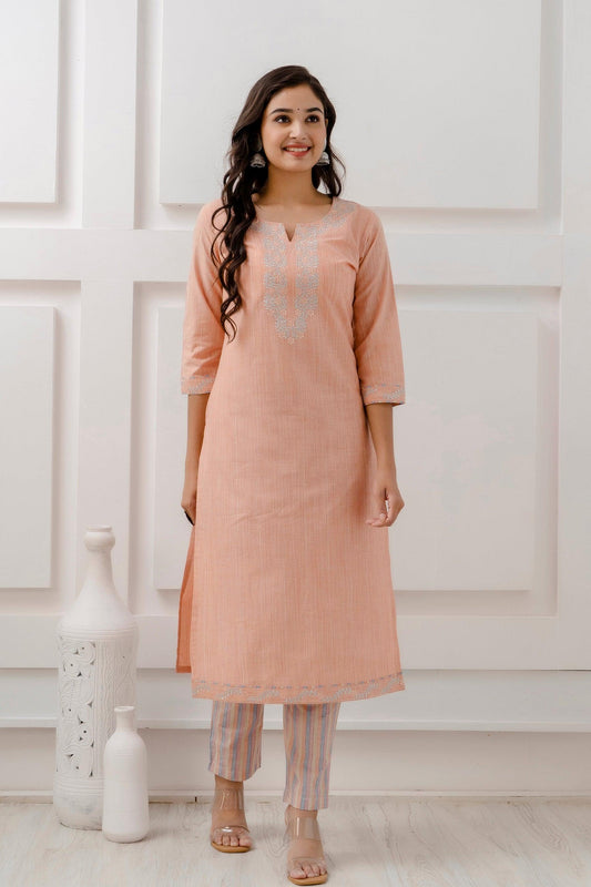 Peach Handloom Cotton Mirror Work Embroidery Kurta Pant Set