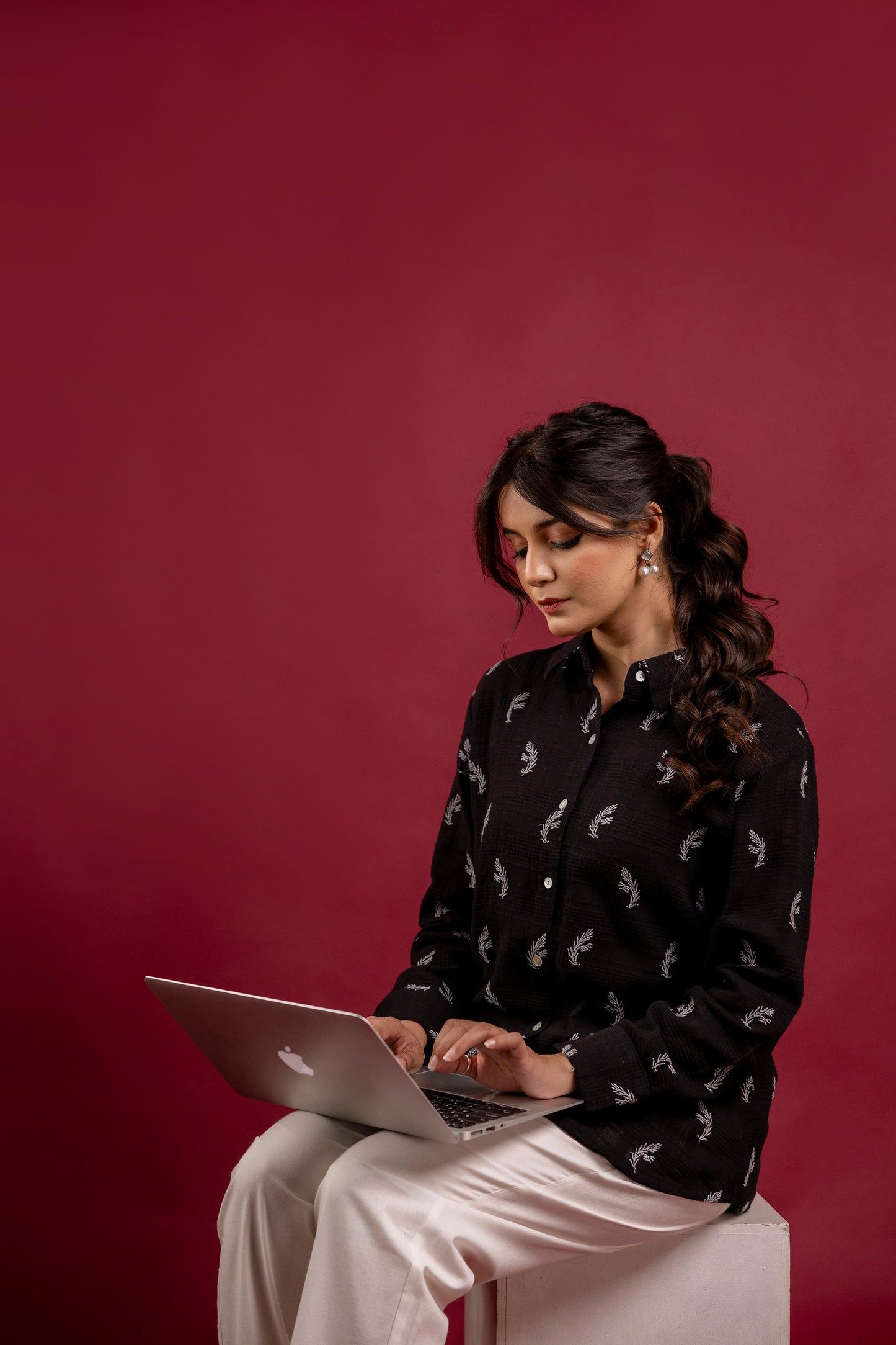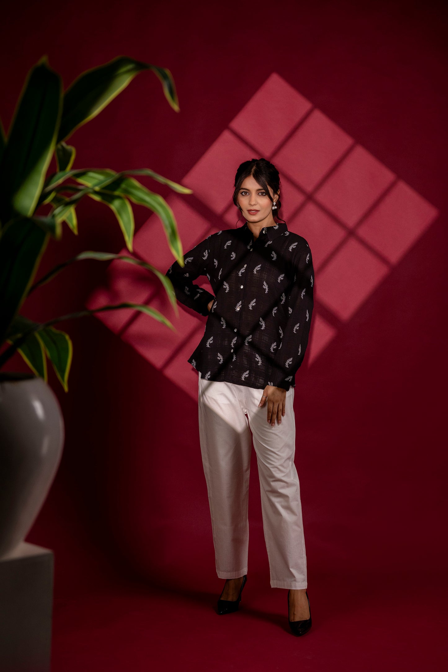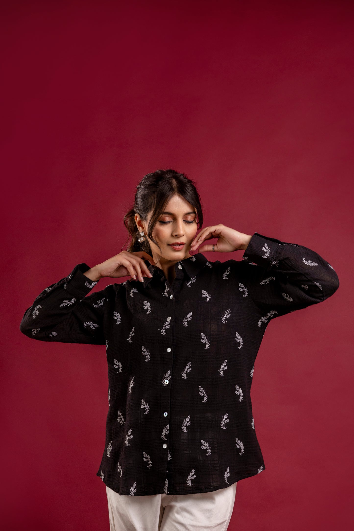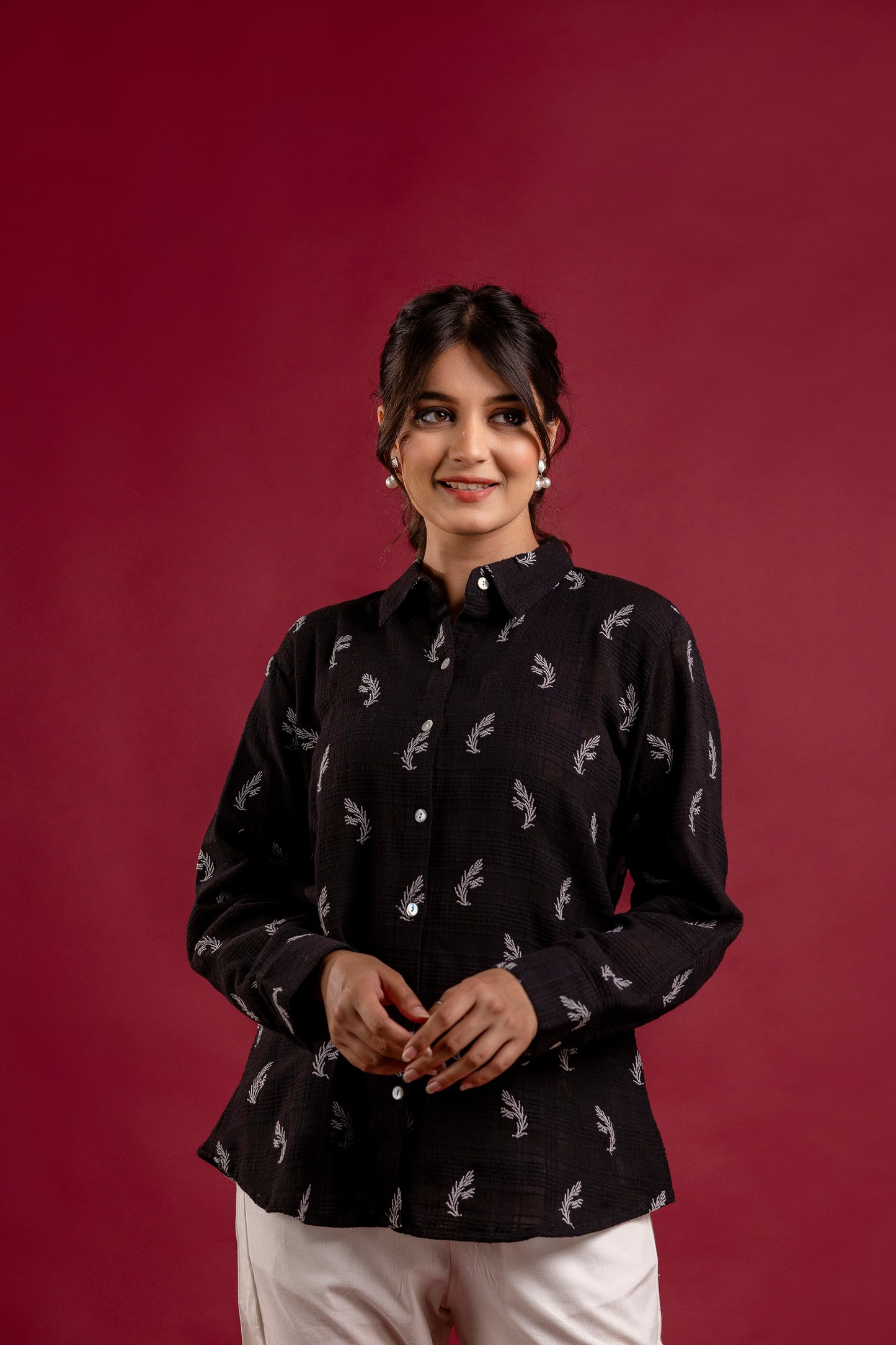 Elevate your wardrobe with this elegant Black Woven Jacquard Cotton Women's Shirt. Crafted from premium quality cotton, this shirt offers both comfort and durability. The self-woven fabric adds a touch of sophistication, while the subtle grey leaf pattern on it infuses a natural charm. Featuring a functional front placket with buttons, this shirt provides versatile styling options. The full sleeves are designed with cuffs, adding a refined finish to the overall look.