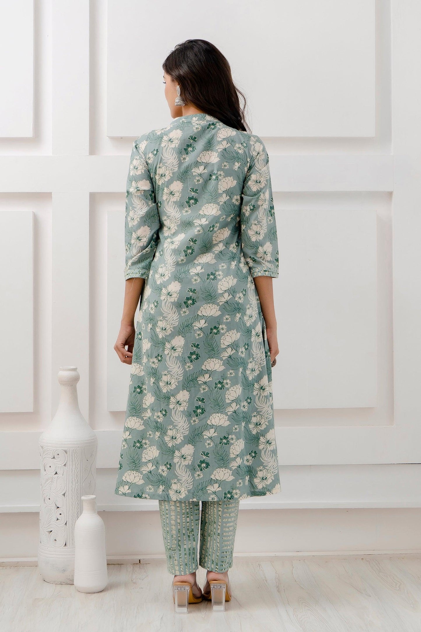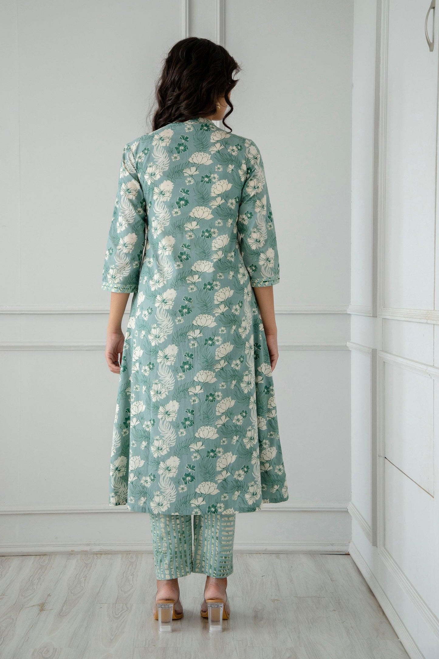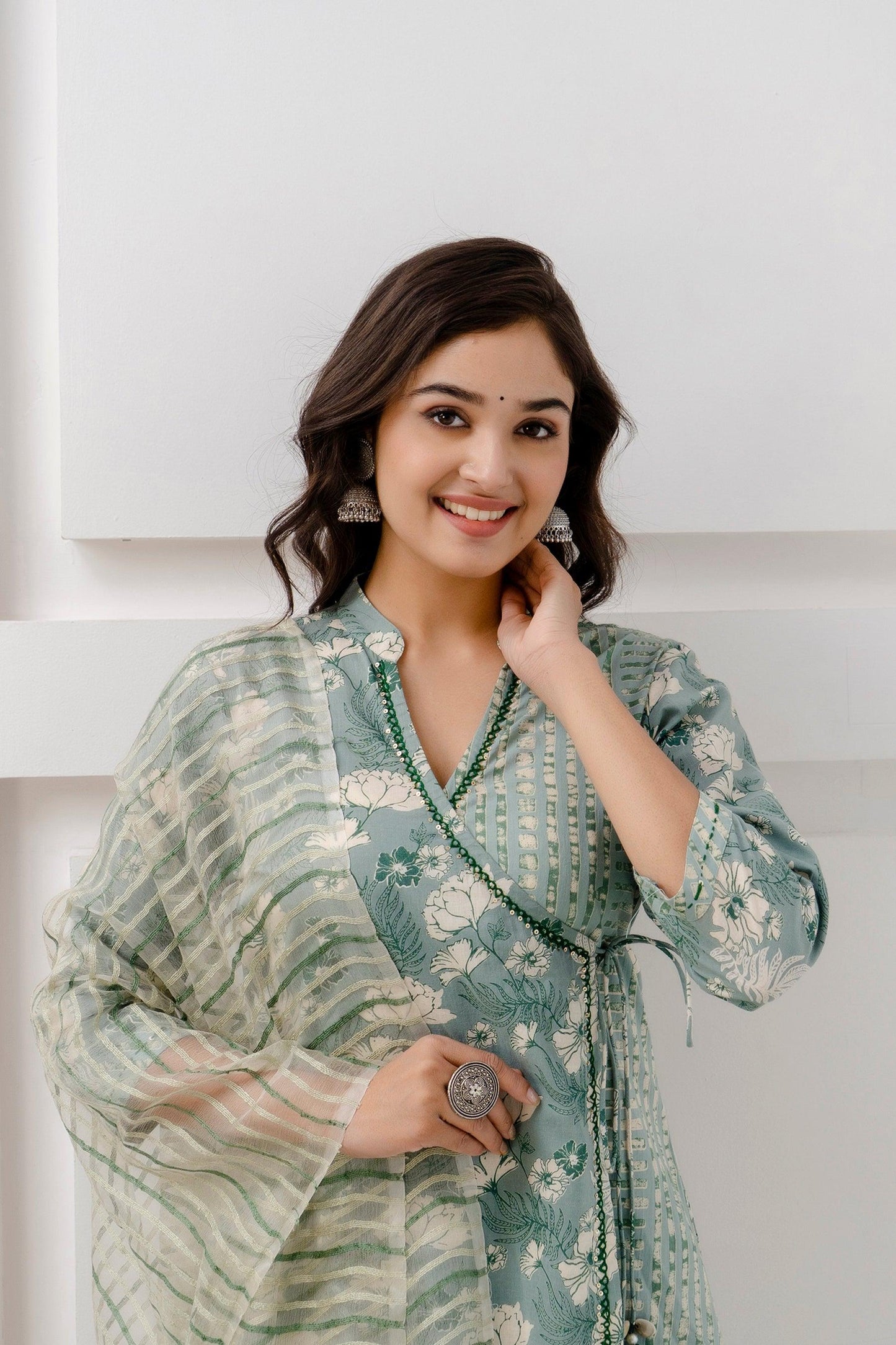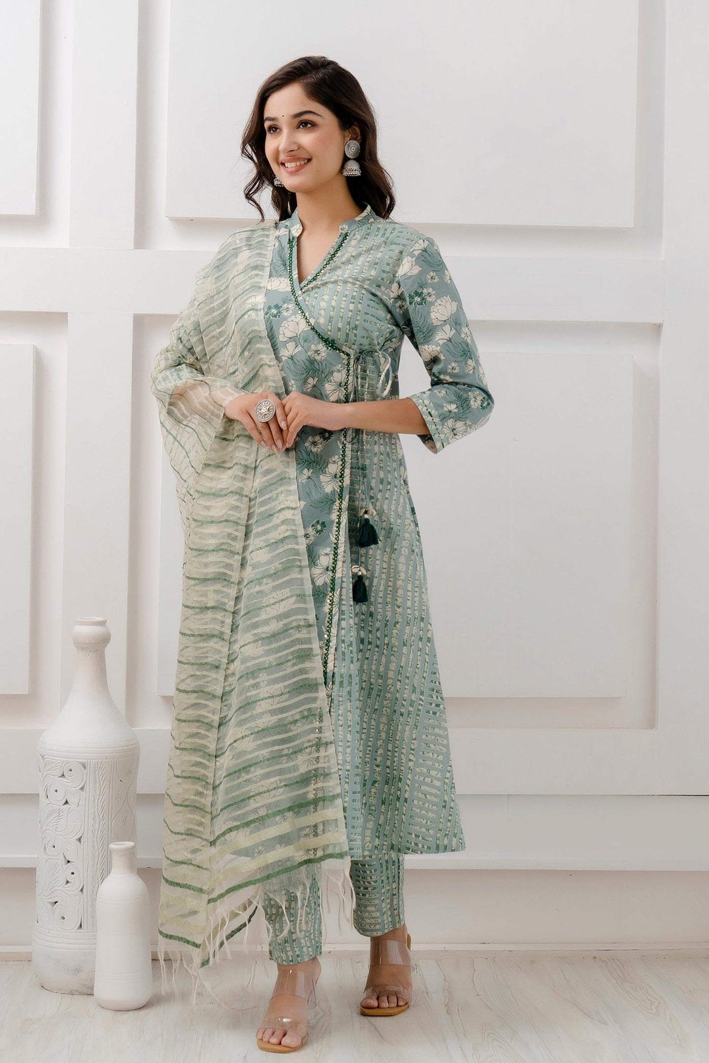 Dusty Green Printed Cotton Angarkha Kurta Pant Dupatta Set
