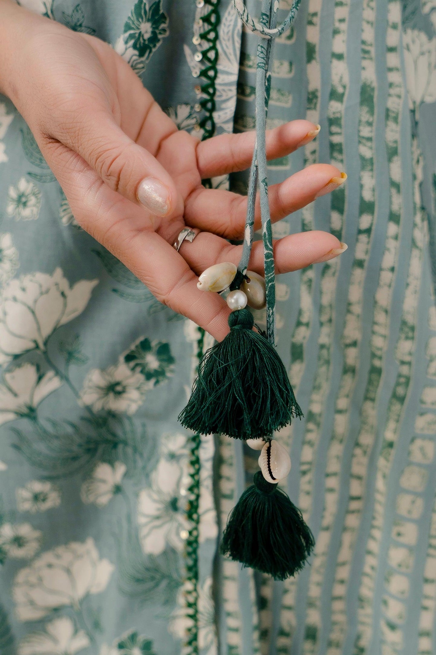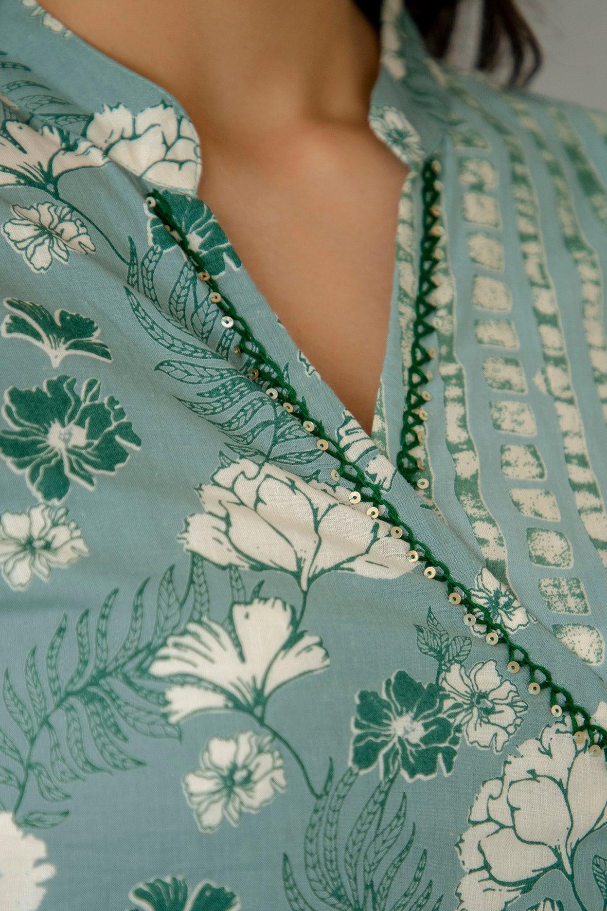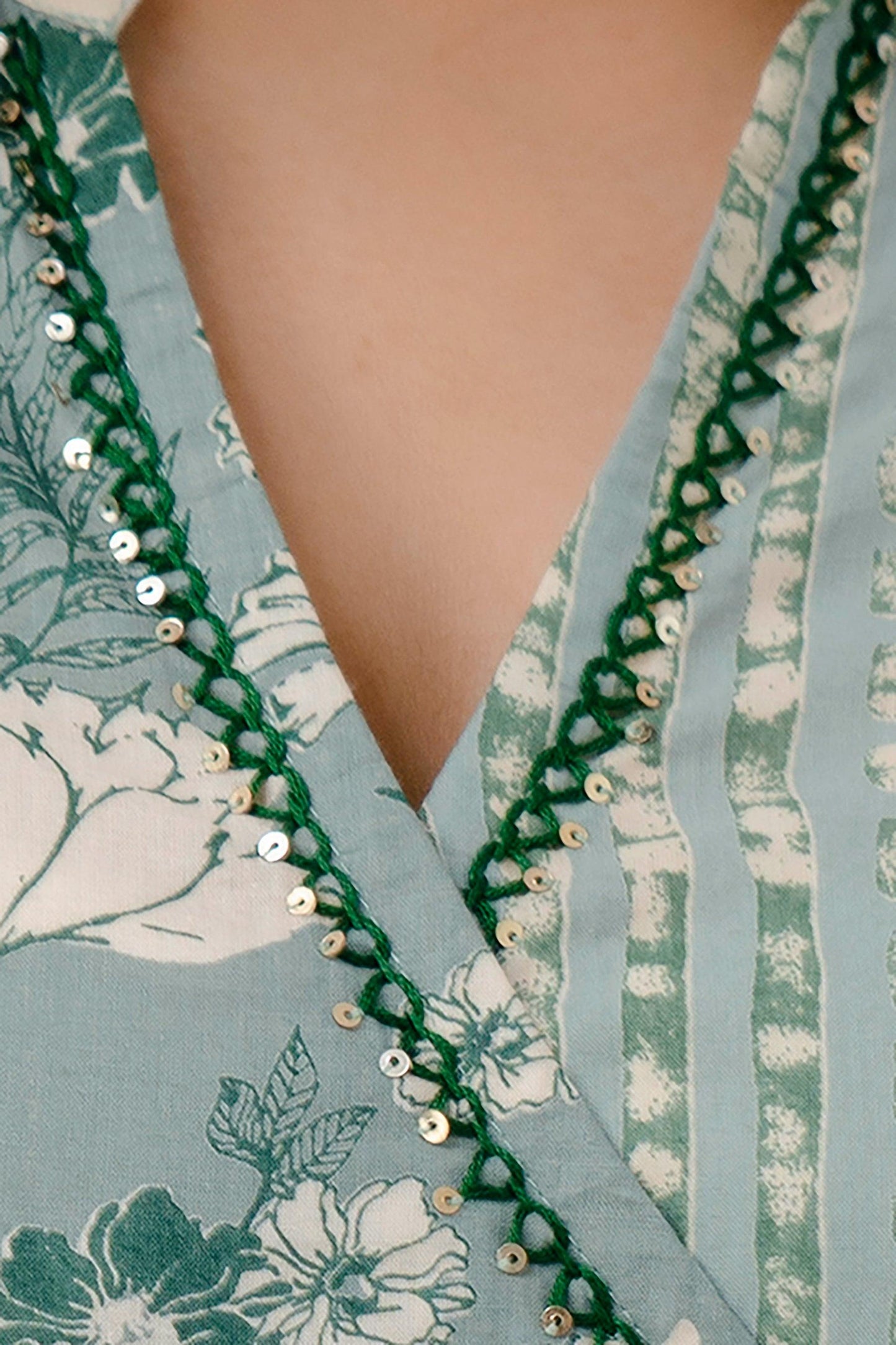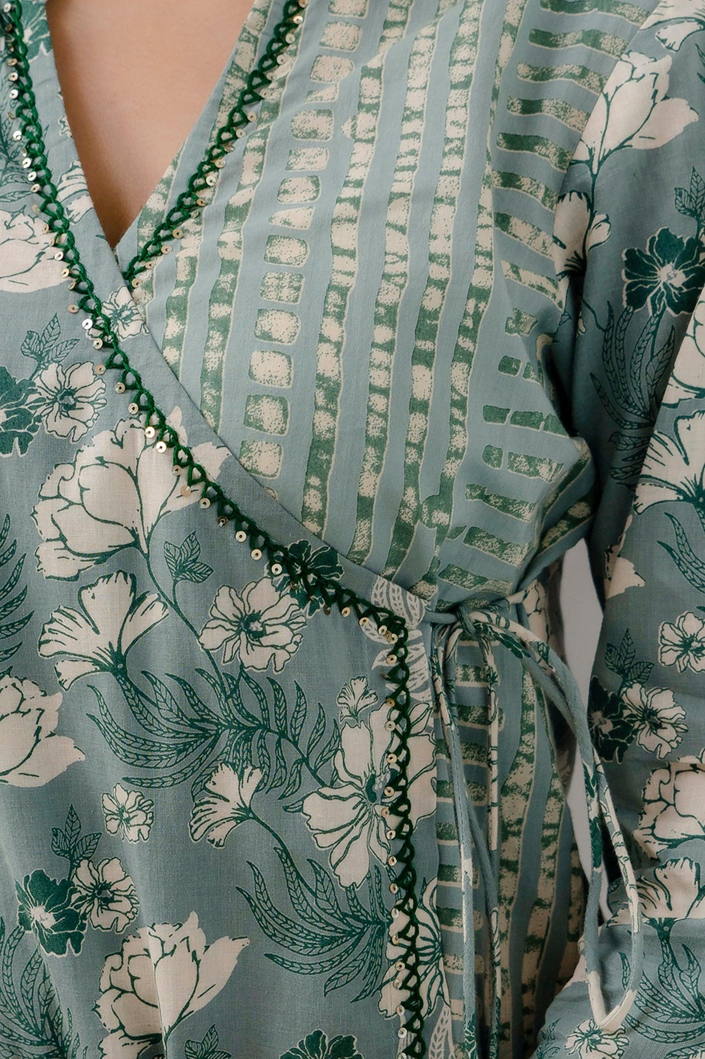 Dusty Green Printed Cotton Angarkha Kurta Pant Dupatta Set