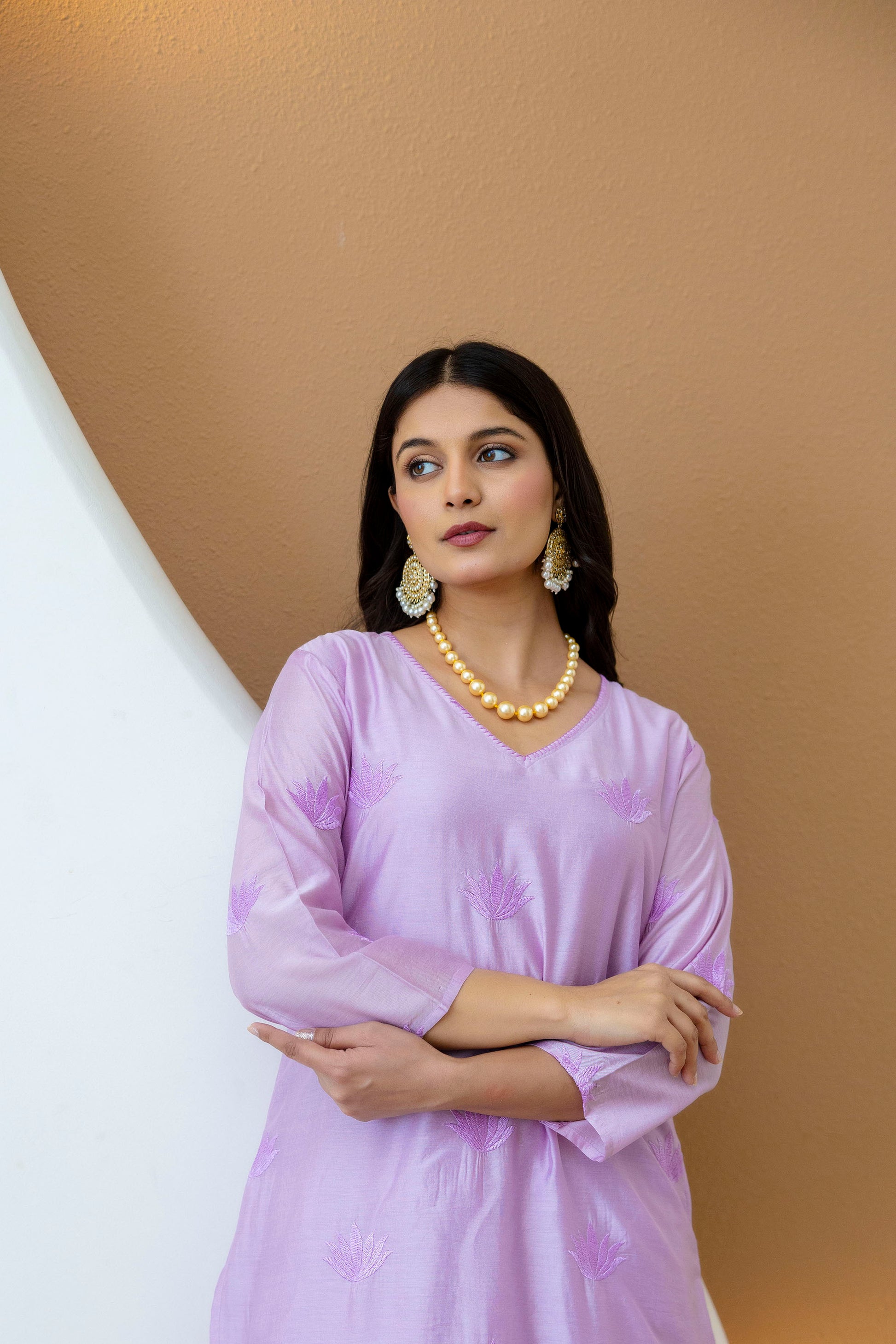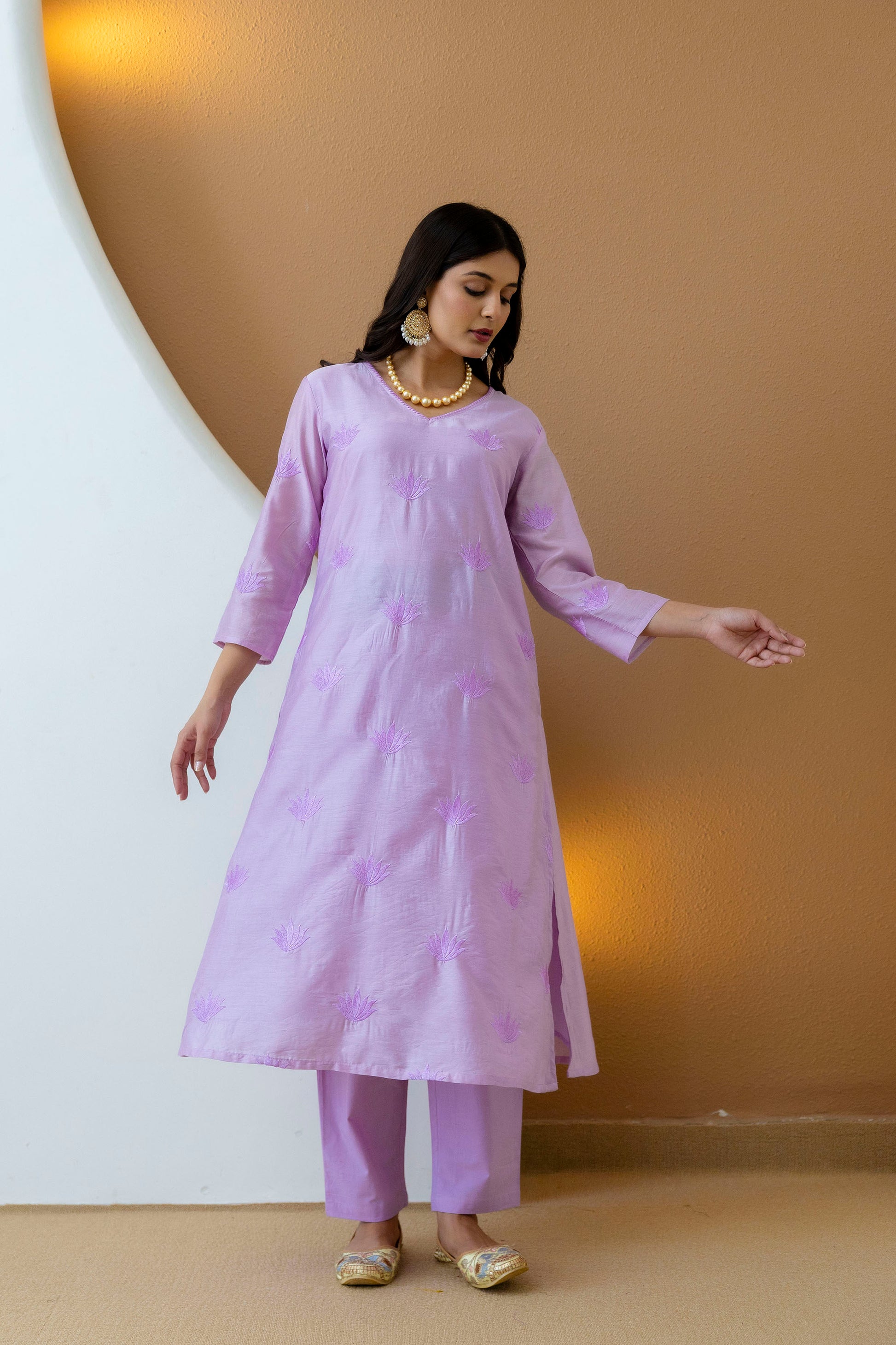 Elevate your Festive ethnic wardrobe with our Lilac Chanderi Embroidered Kurta Pant Set. This elegant ensemble features floral overall embroidered A-line kurta with a V-neck adorned with hand embroidery on the neck. Kurta has one pocket and embroidered 3/4th sleeves, whereas, the back is plain. Cotton poplin pants come with an elasticated waistband for a comfortable fit and include a convenient side pocket. Perfect for formal outings or festive occasions, this kurta pant set combines traditional craftsmanship with contemporary design.