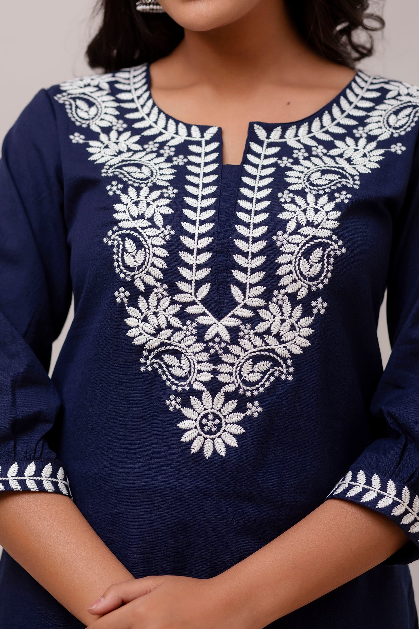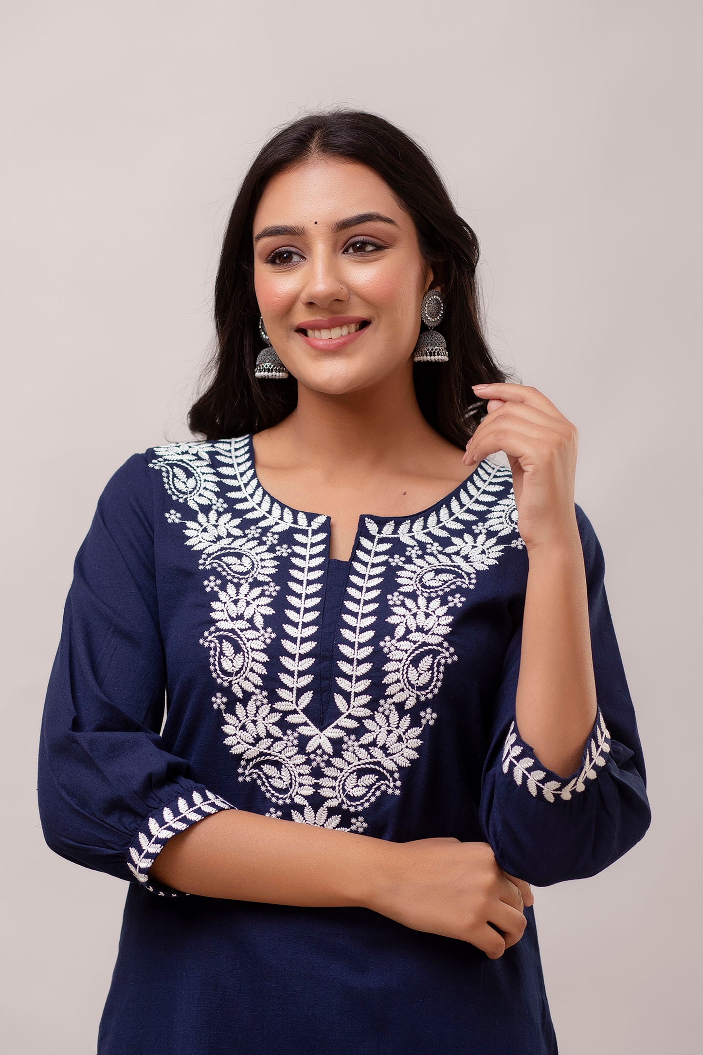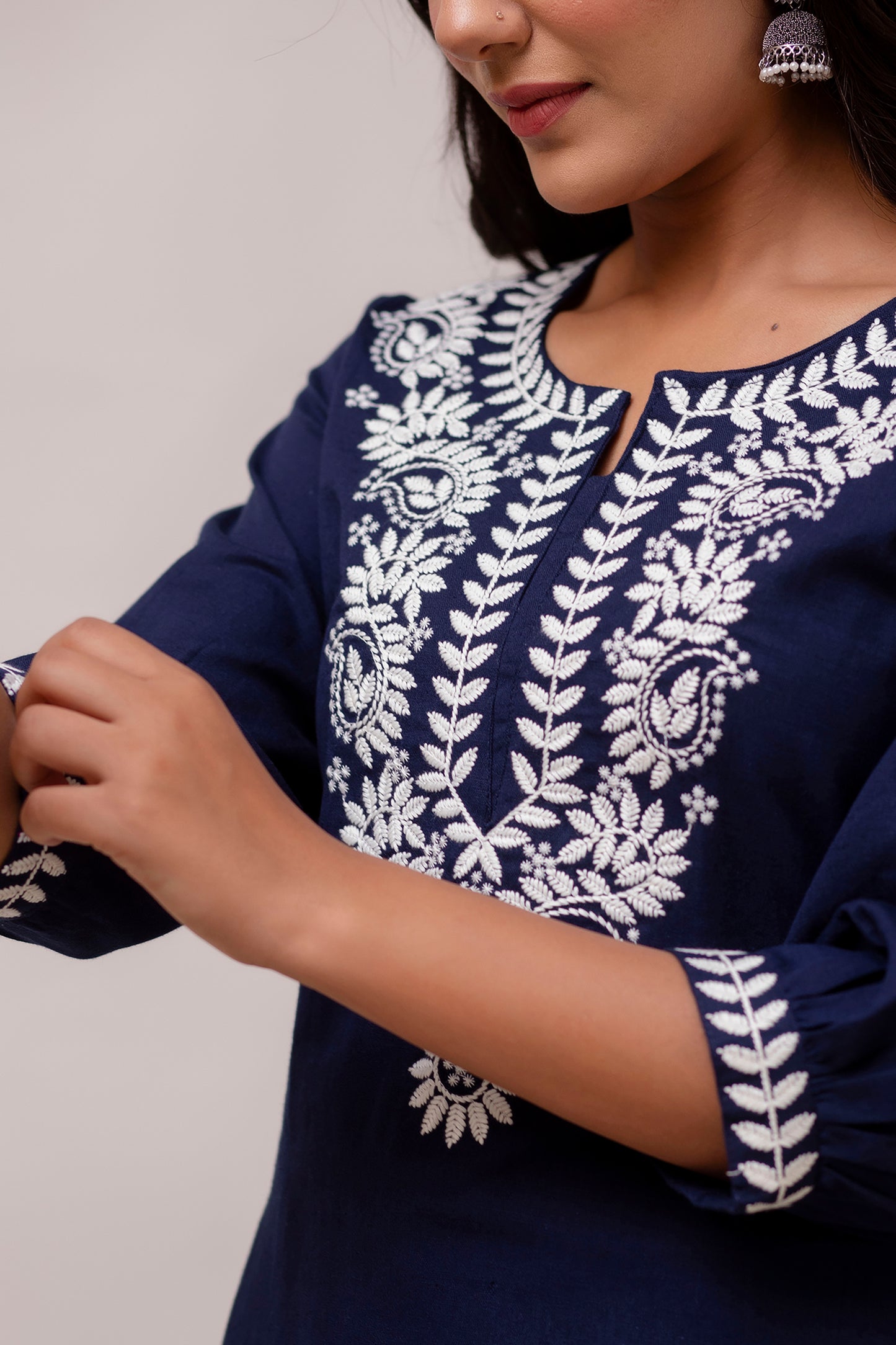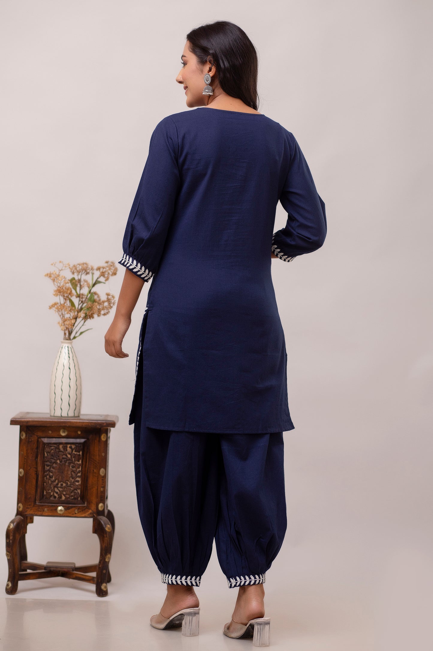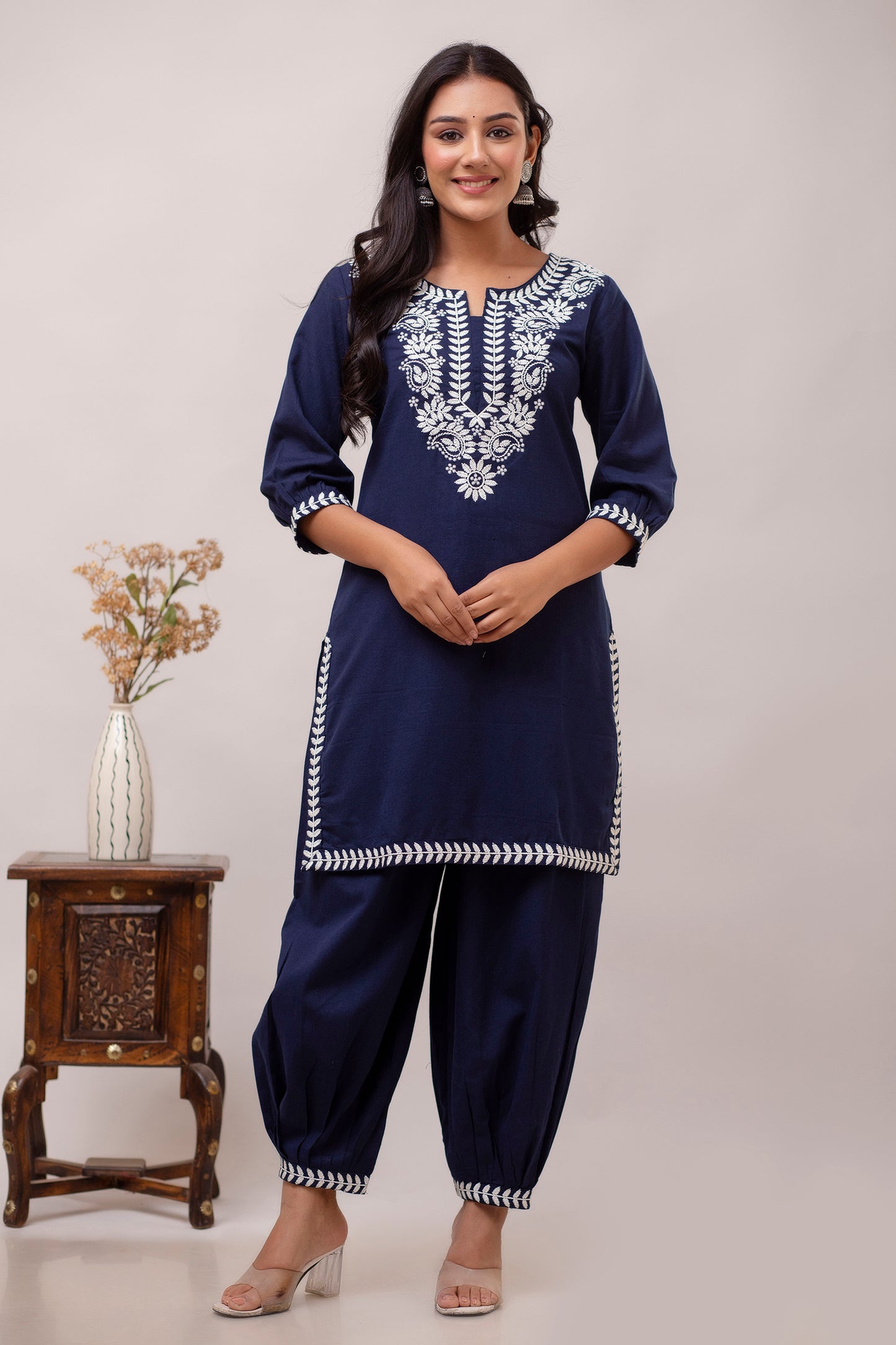 Introducing our Nay Blue Cotton Embroidered Co-Ord Set featuring intricate chikankari embroidery showcasing impeccable craftsmanship. The straight kurta is short in length with round neckline and elegant 3/4th embroidered and pleated sleeves. The set is complete with elasticated afghani pants and one side pocket and embroidred detailing at the bottom. This contemporary design co-ord set is perfect addition to your wardrobe and has an ideal fit and is easy to wear and care.