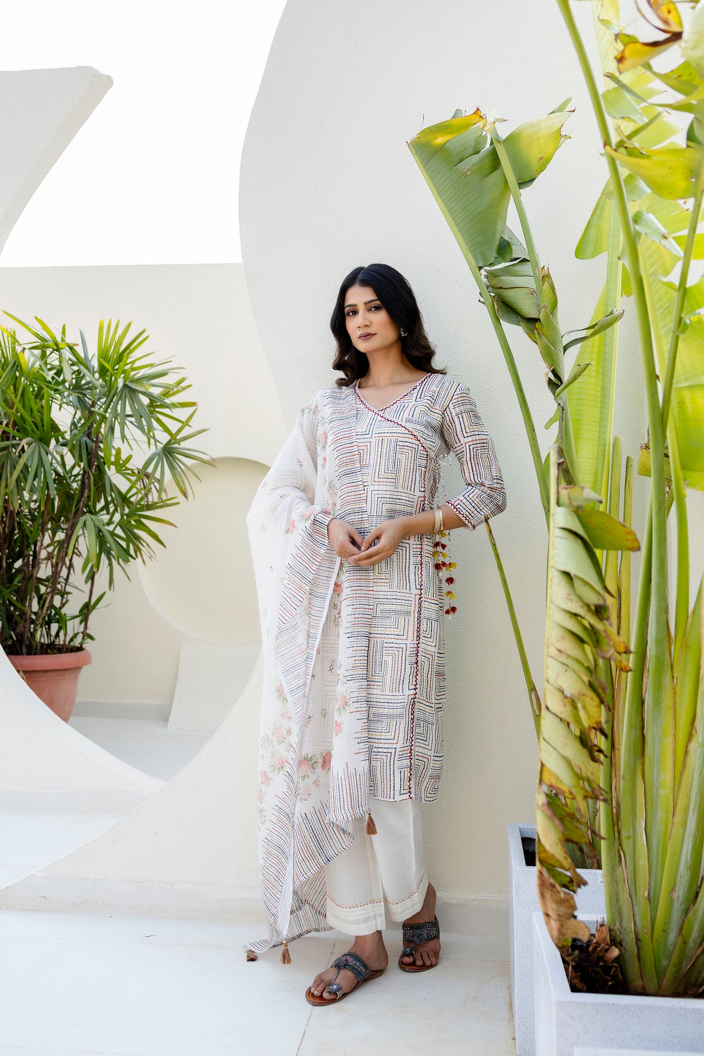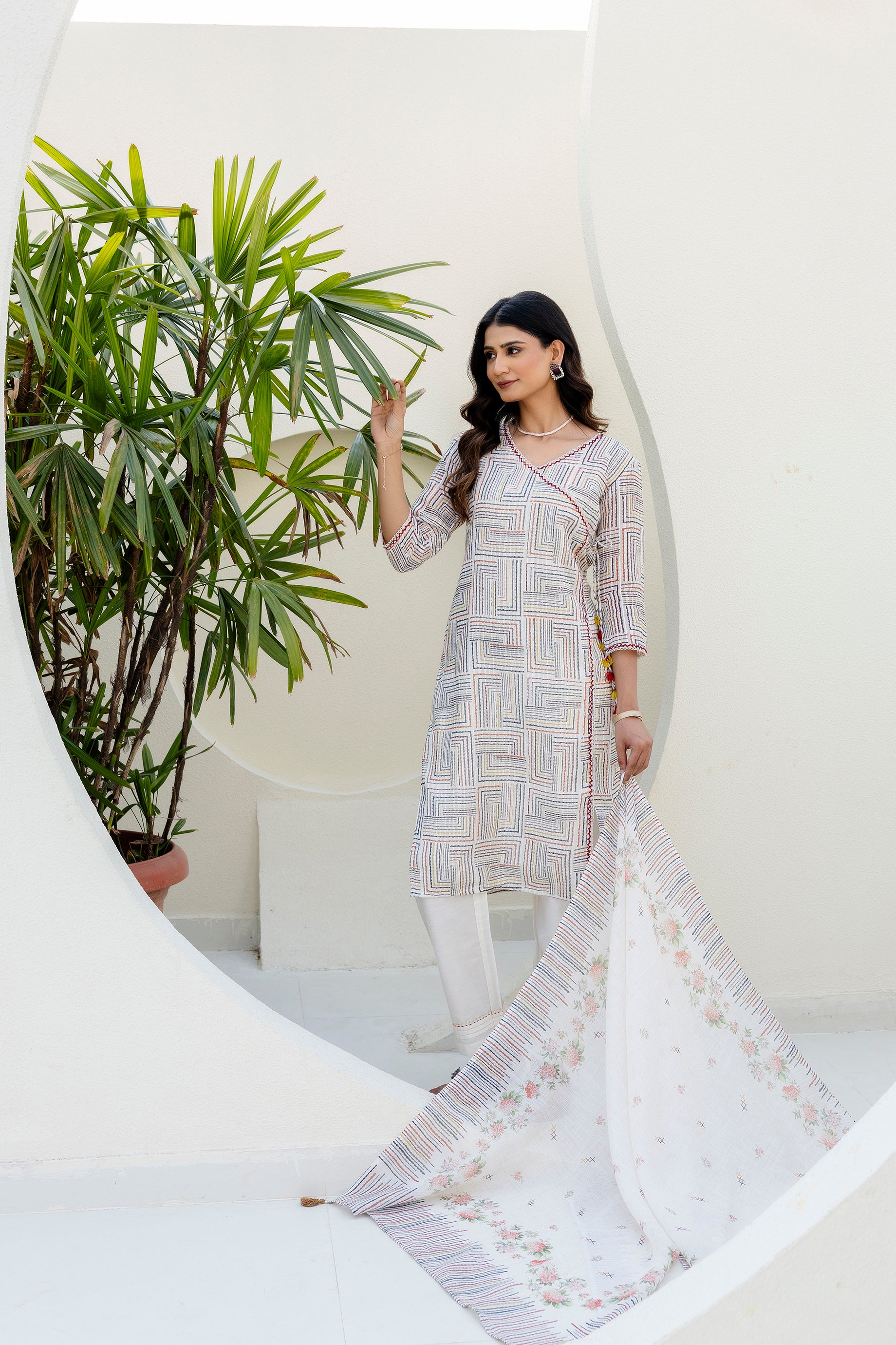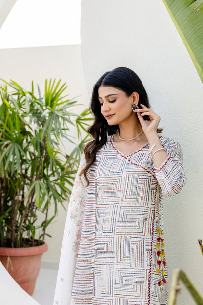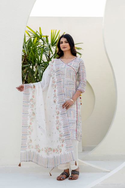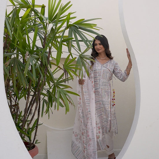 Off White Chanderi Jacquard Angarkha kurta Pant & Dupatta
