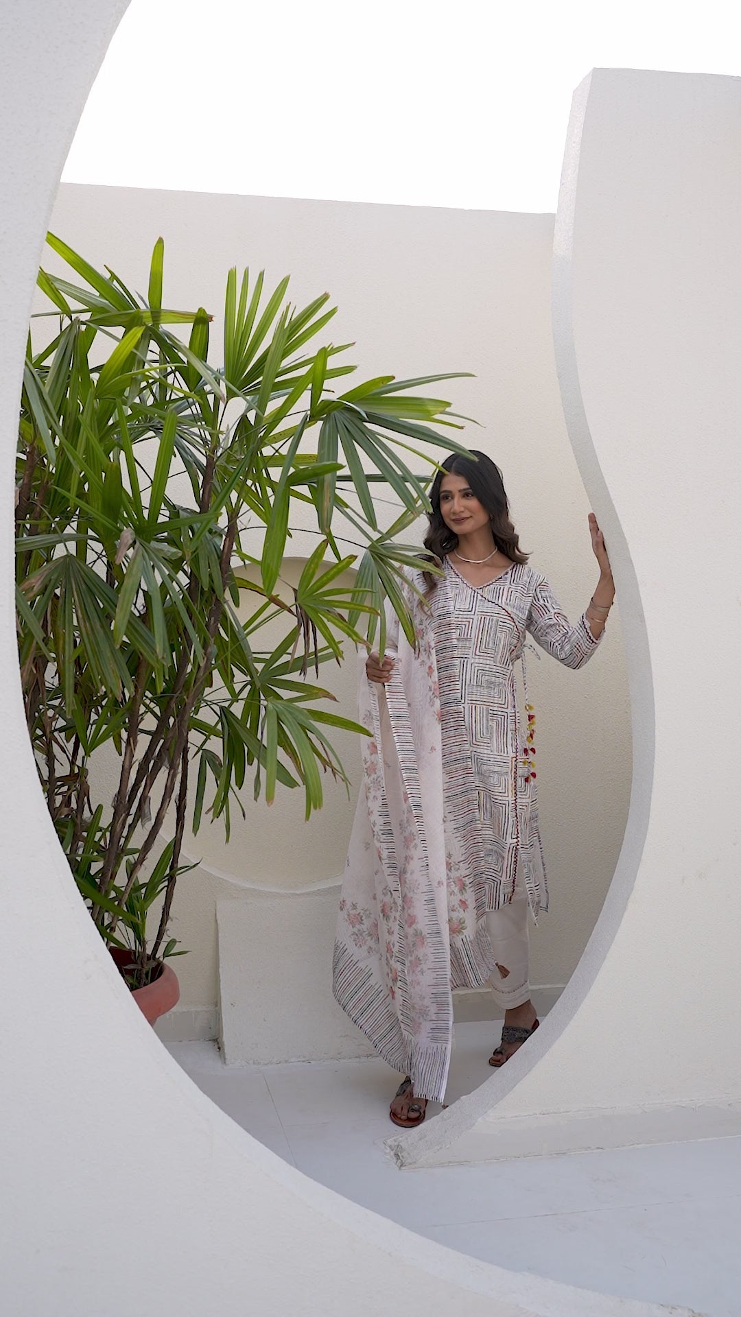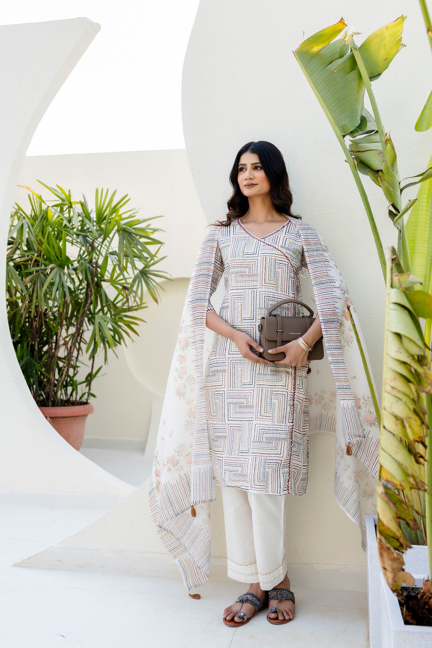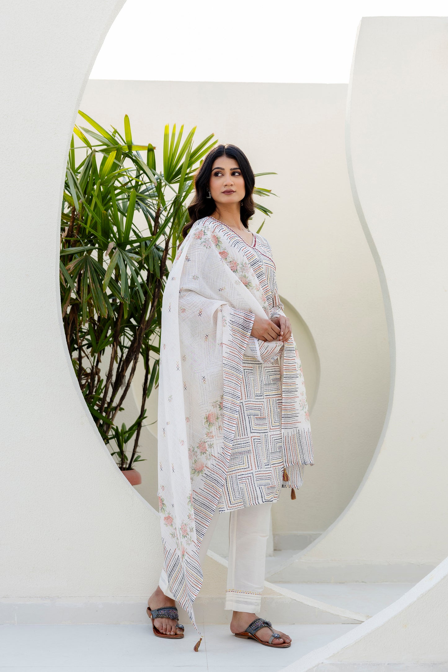 Off White Chanderi Jacquard Angarkha kurta Pant & Dupatta