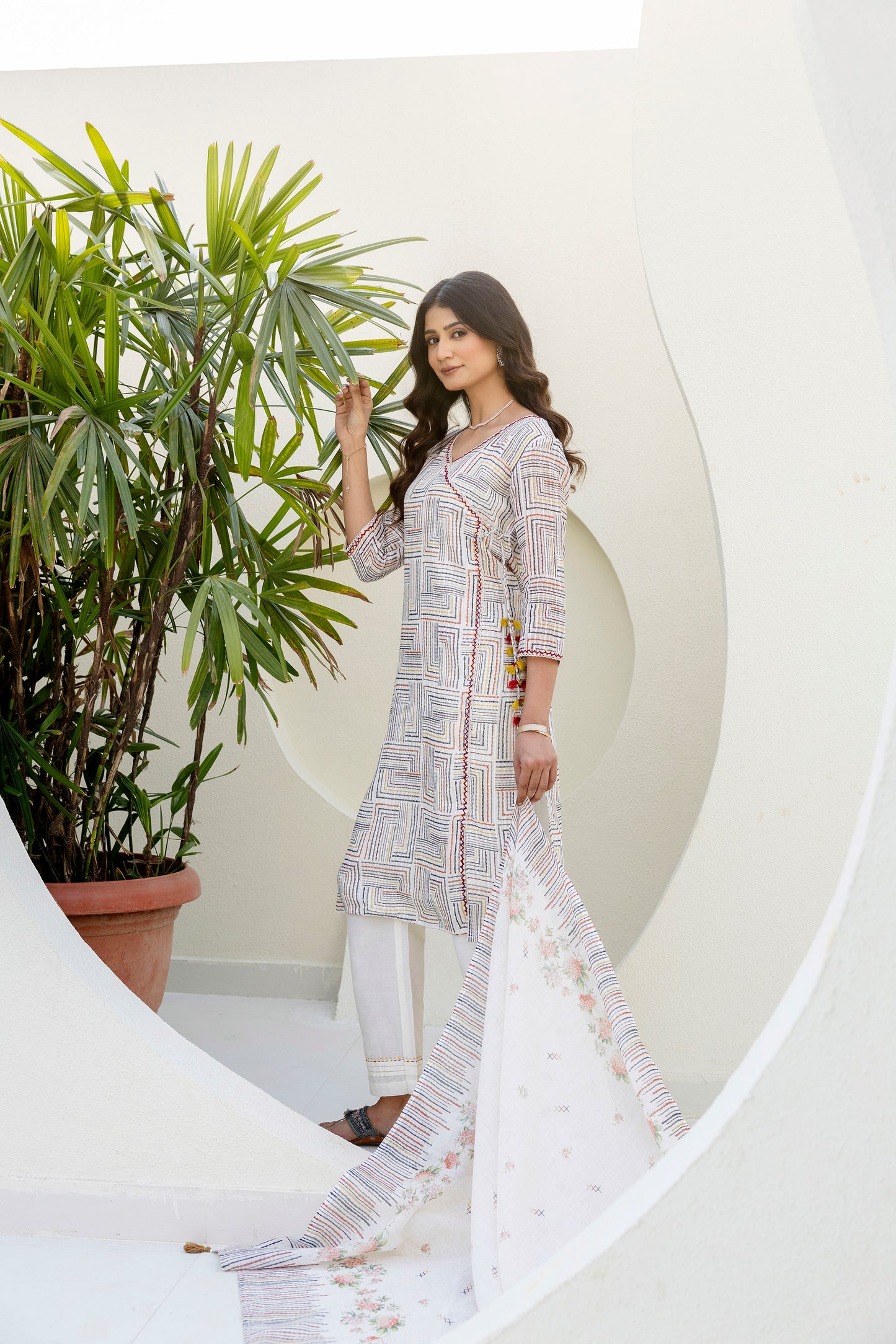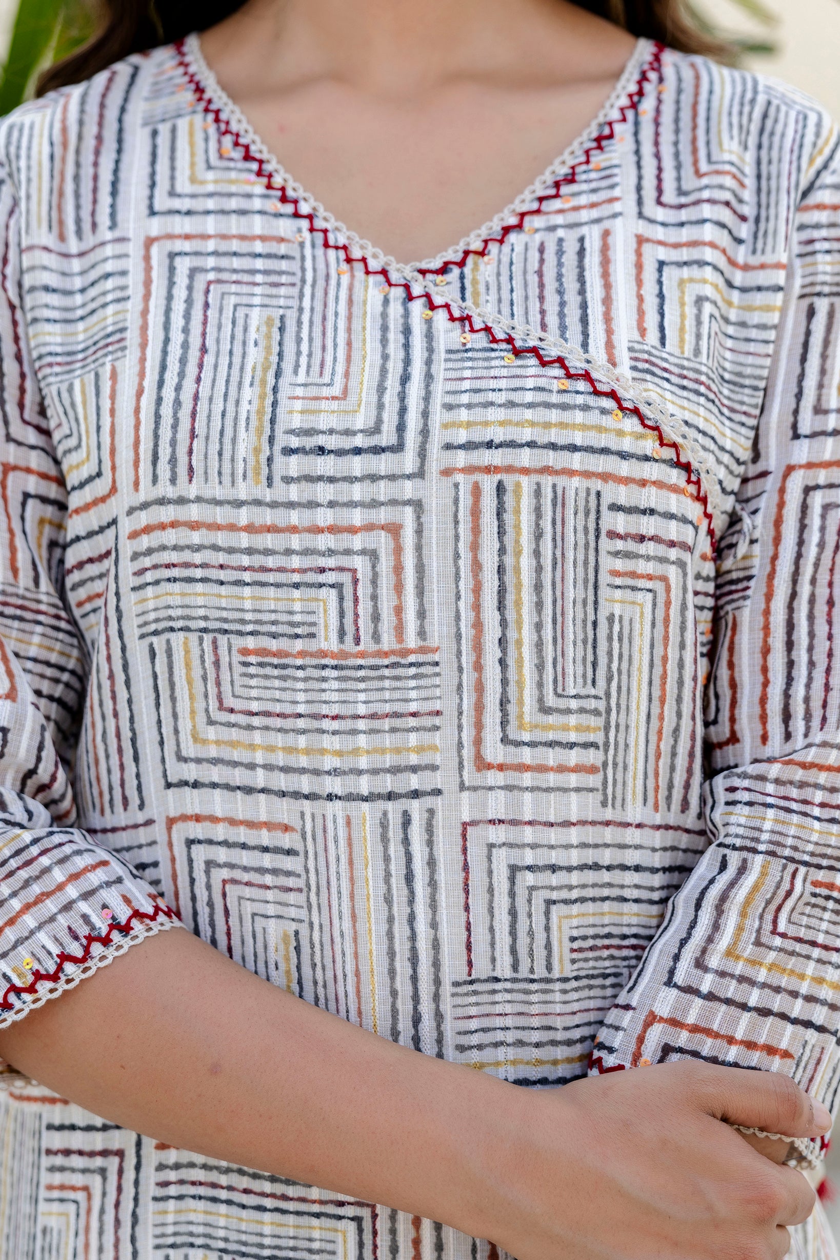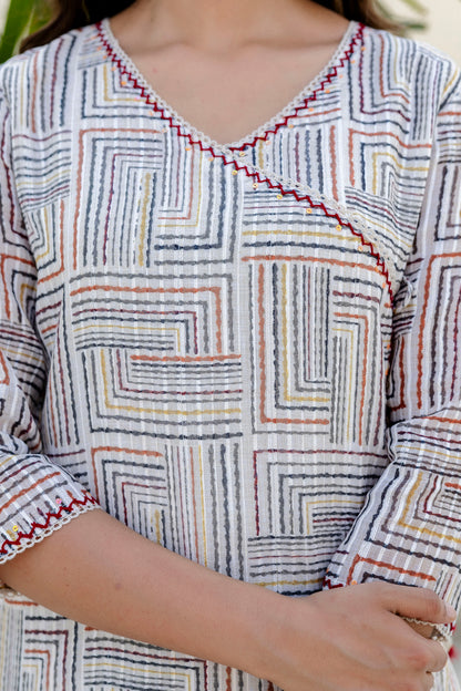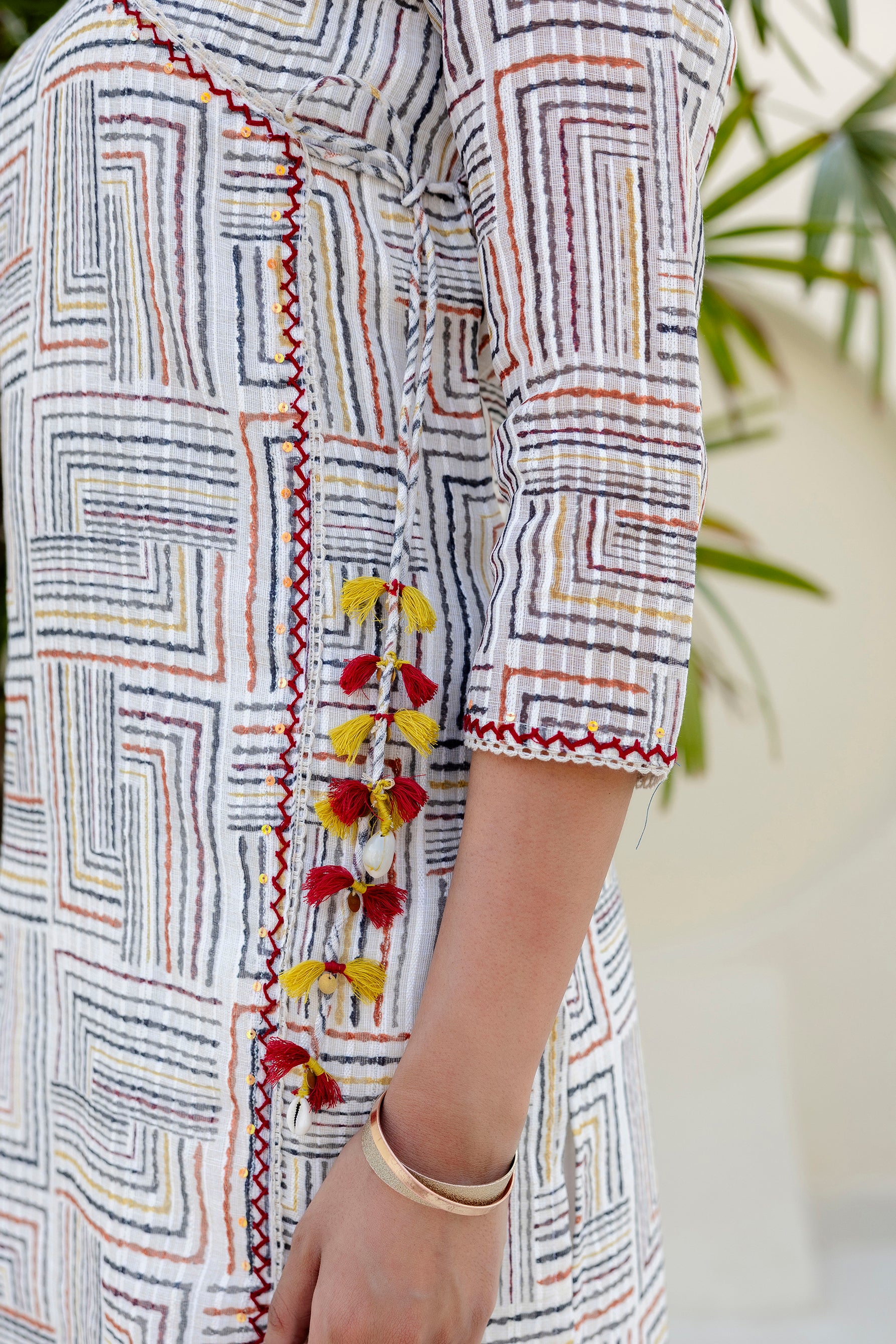 Make a statement with this beautiful self weave off-white Angarkha-style Suit Set. The kurta is crafted in a multi-colored self-weave fabric and comes with a soft cotton lining for all-day comfort. It features elegant lace detailing along the neckline and front panel, accentuated with delicate hand-done sequins work that adds just the right amount of sparkle. The signature angarkha silhouette is elevated with charming shell tassels on the side, bringing a playful yet graceful touch. A pocket on right side makes the kurta practical and side slits add to its functionality and adds to the ease of movement.