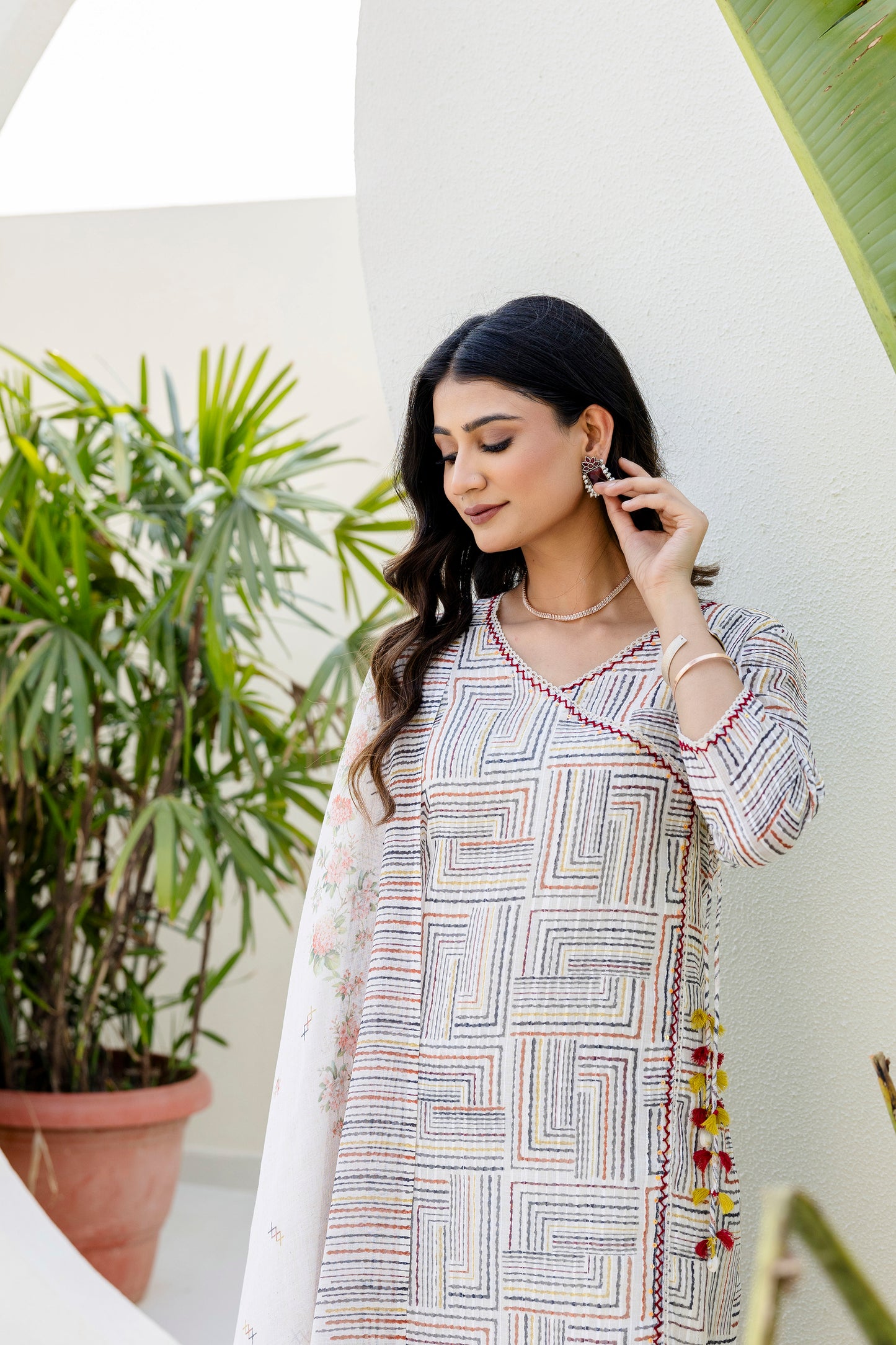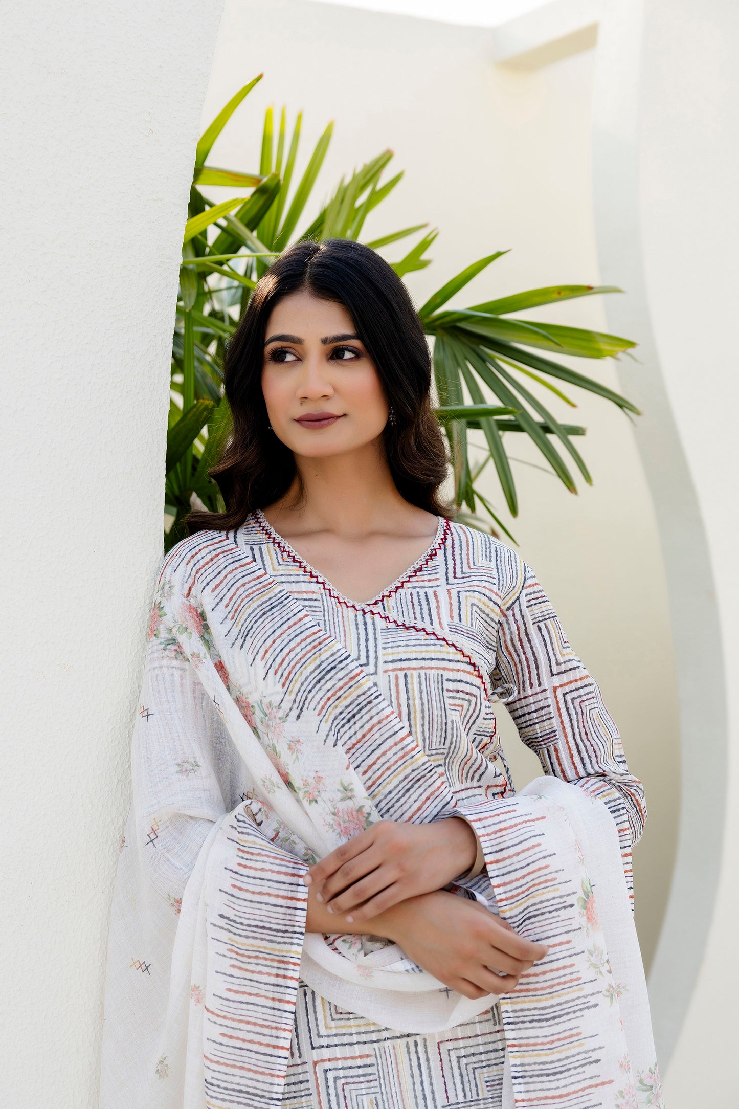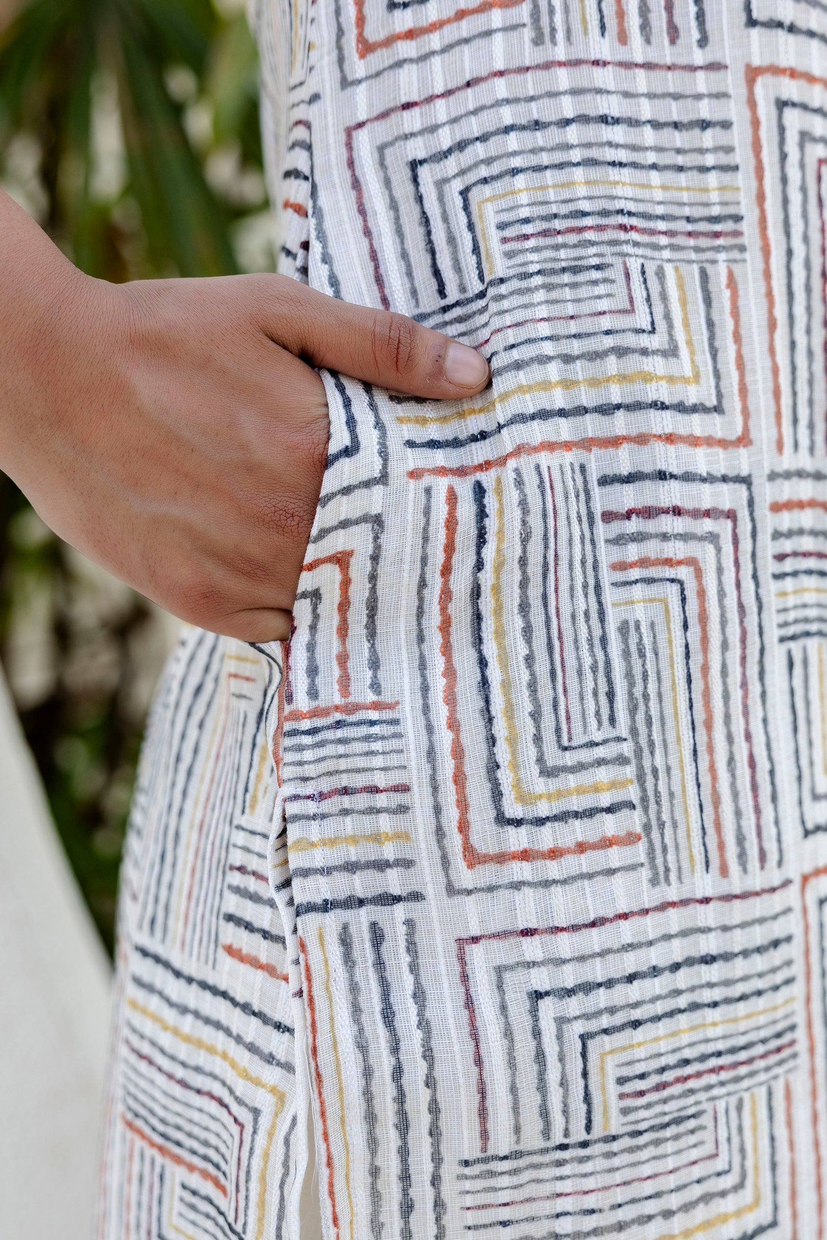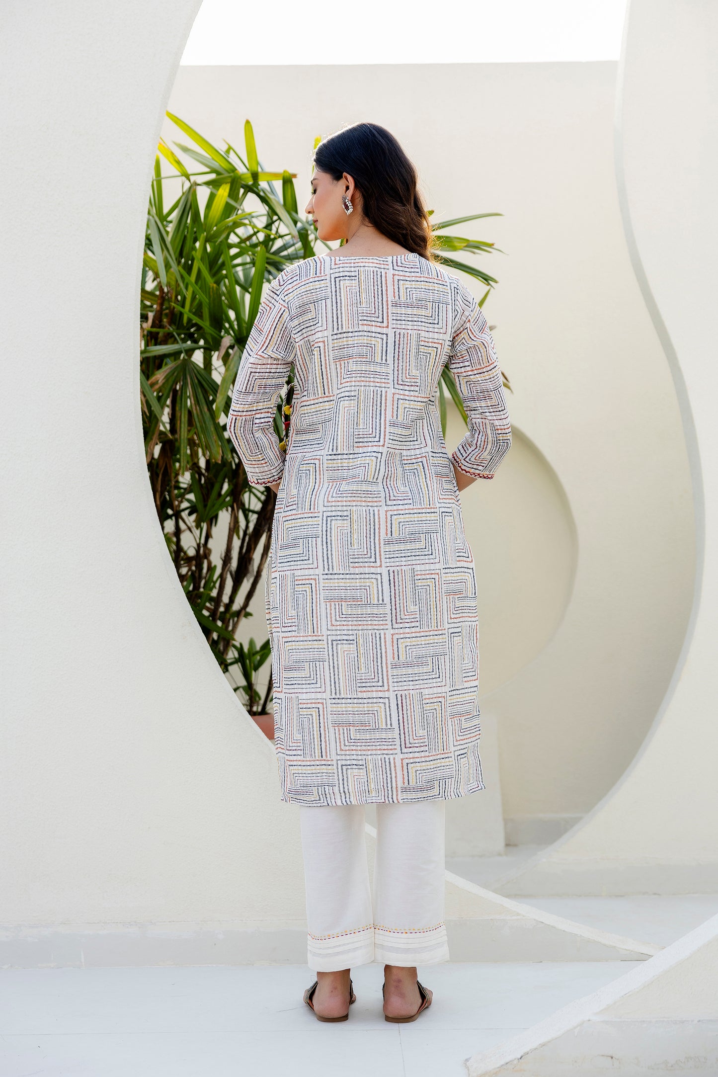 Make a statement with this beautiful self weave off-white Angarkha-style Suit Set. The kurta is crafted in a multi-colored self-weave fabric and comes with a soft cotton lining for all-day comfort. It features elegant lace detailing along the neckline and front panel, accentuated with delicate hand-done sequins work that adds just the right amount of sparkle. The signature angarkha silhouette is elevated with charming shell tassels on the side, bringing a playful yet graceful touch. A pocket on right side makes the kurta practical and side slits add to its functionality and adds to the ease of movement.