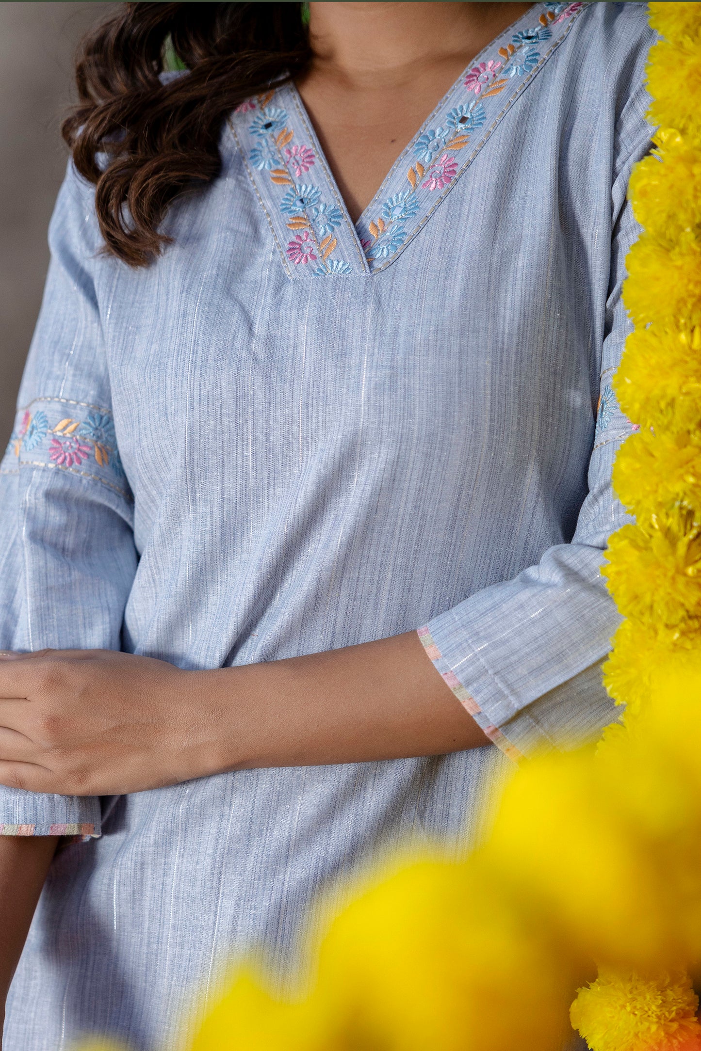 Aqua Blue Handloom Cotton Mirror Work Embroidery Kurta Pant Set