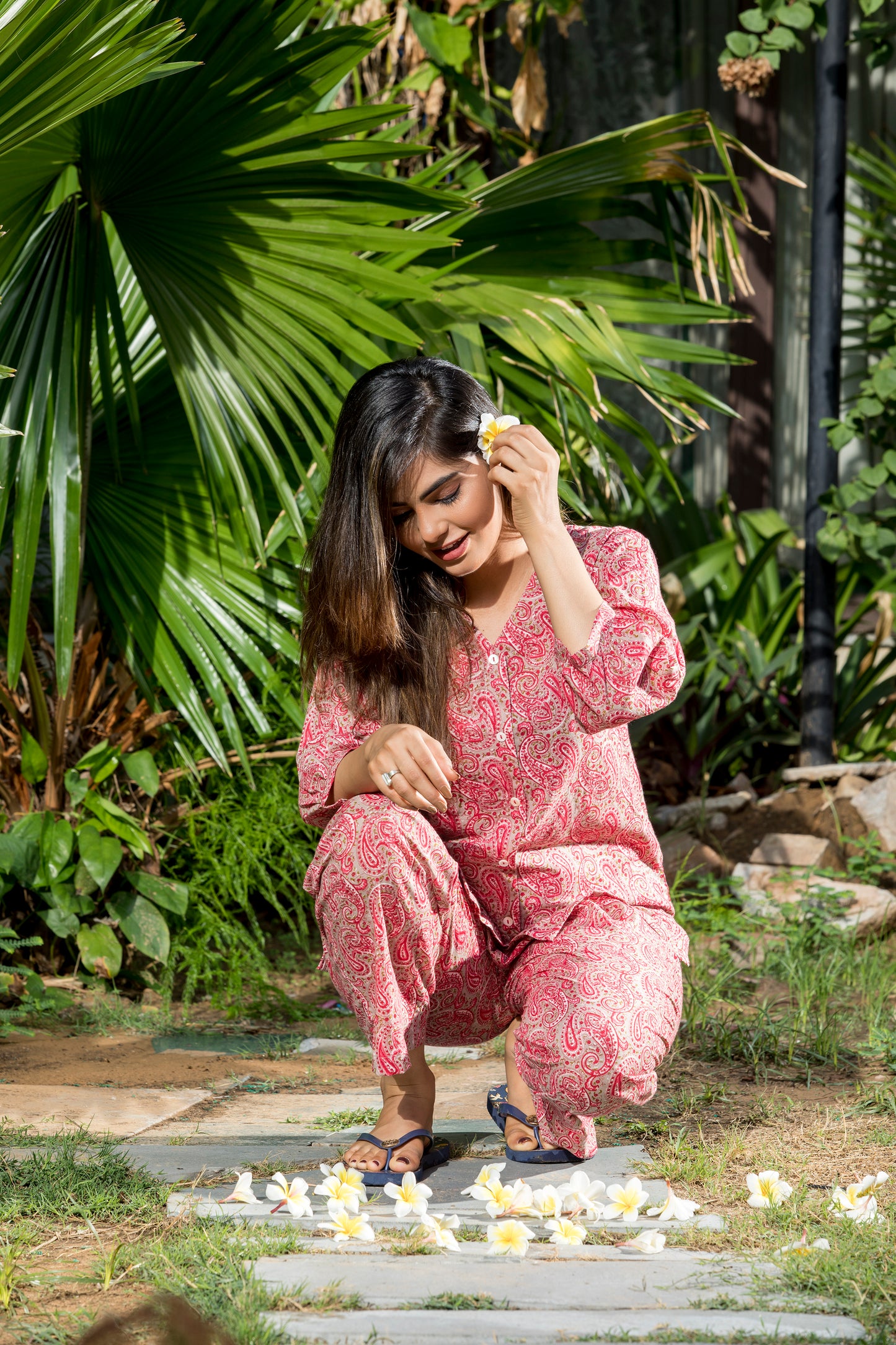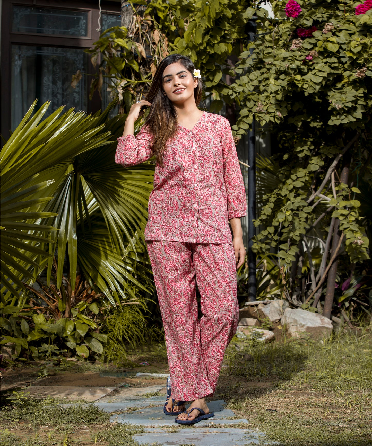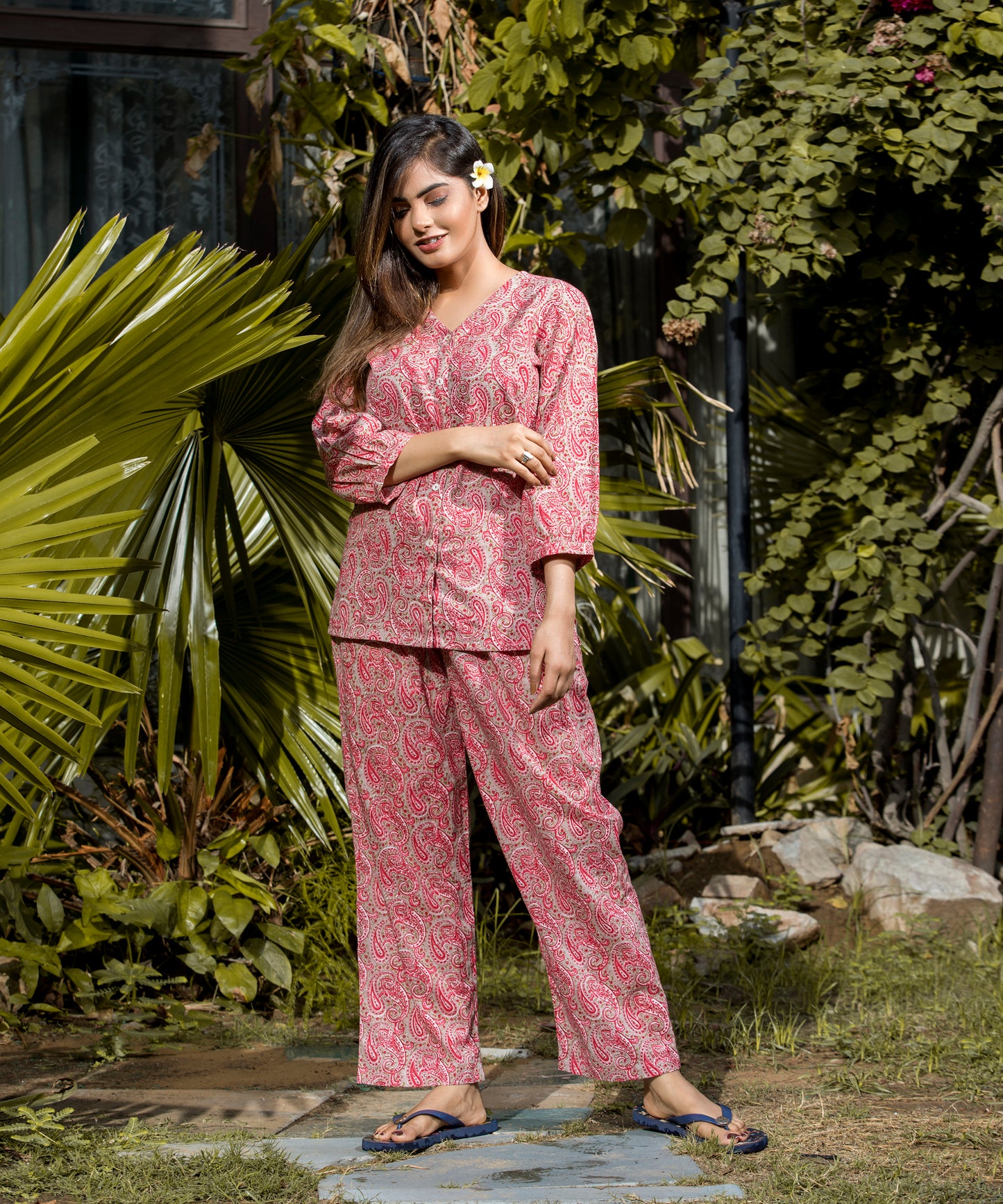 This paisely print cotton lounge wear is a two piece set. V neck top has a non functional placket and 3/4th gathered sleeves with cuff. Pants have elasticated waist and have a comfort fit for ease.