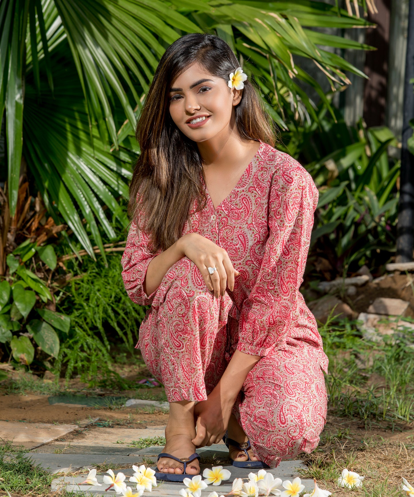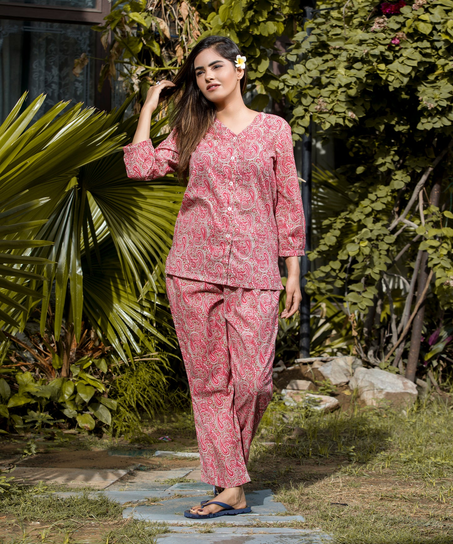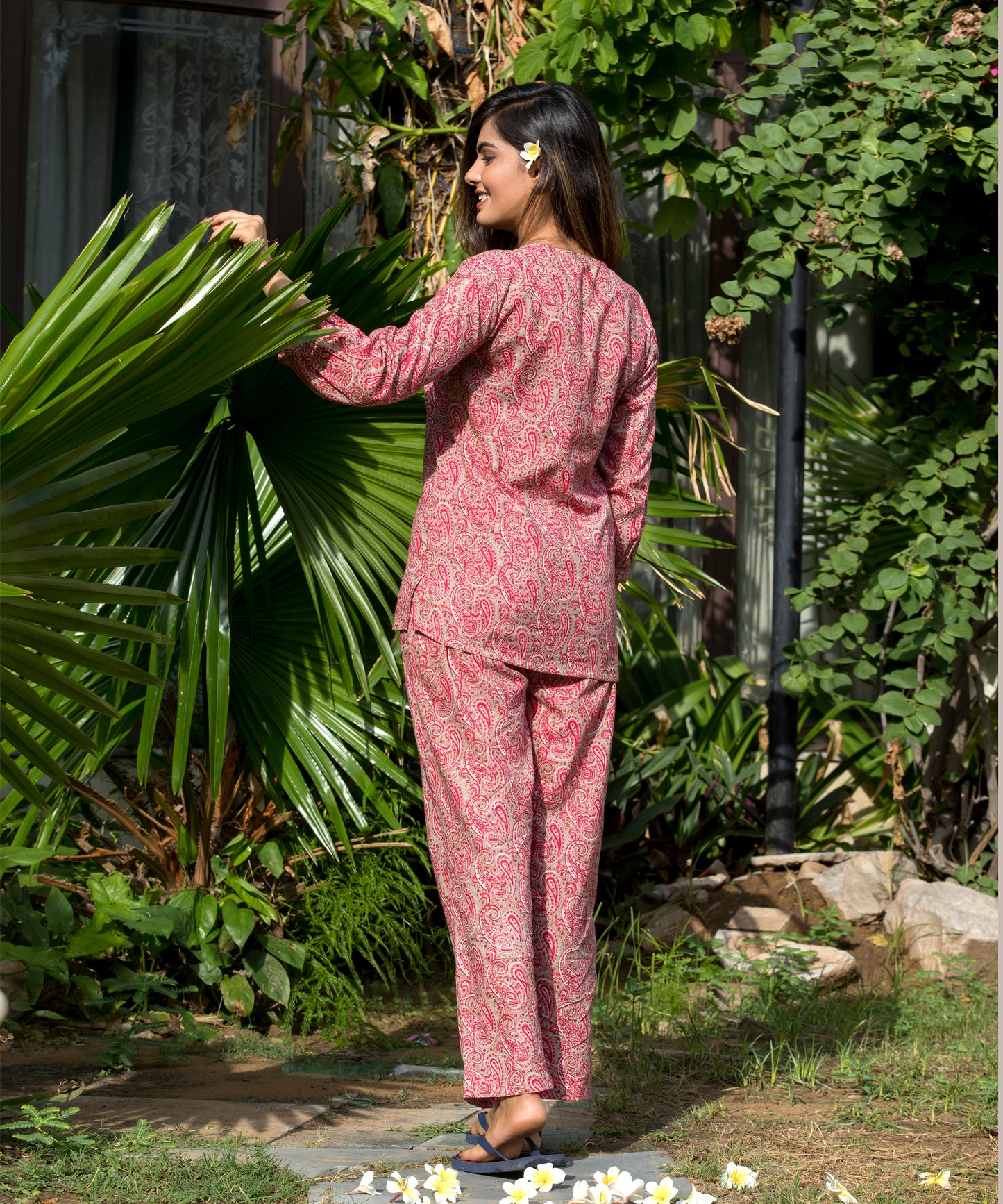 This paisely print cotton lounge wear is a two piece set. V neck top has a non functional placket and 3/4th gathered sleeves with cuff. Pants have elasticated waist and have a comfort fit for ease.