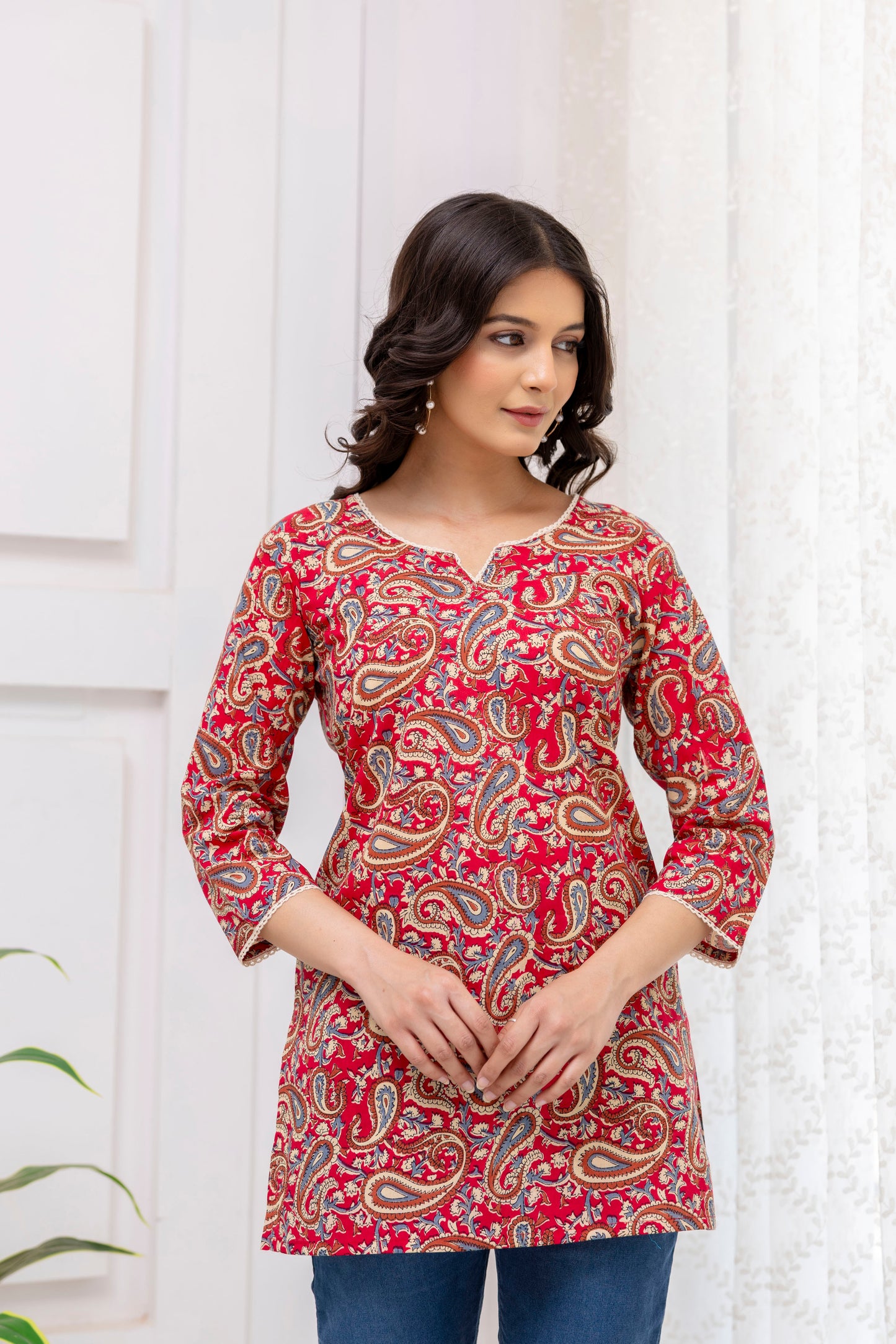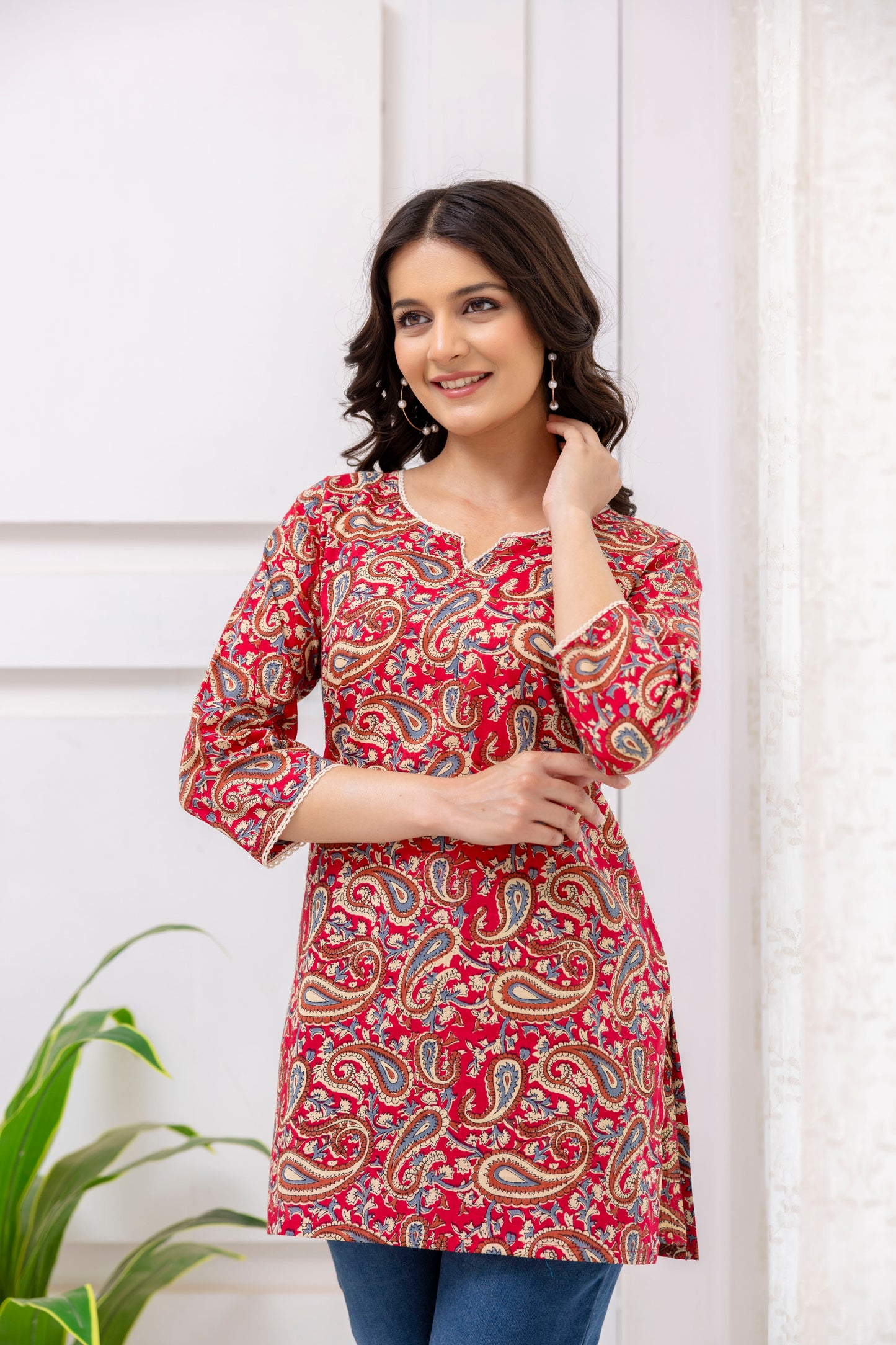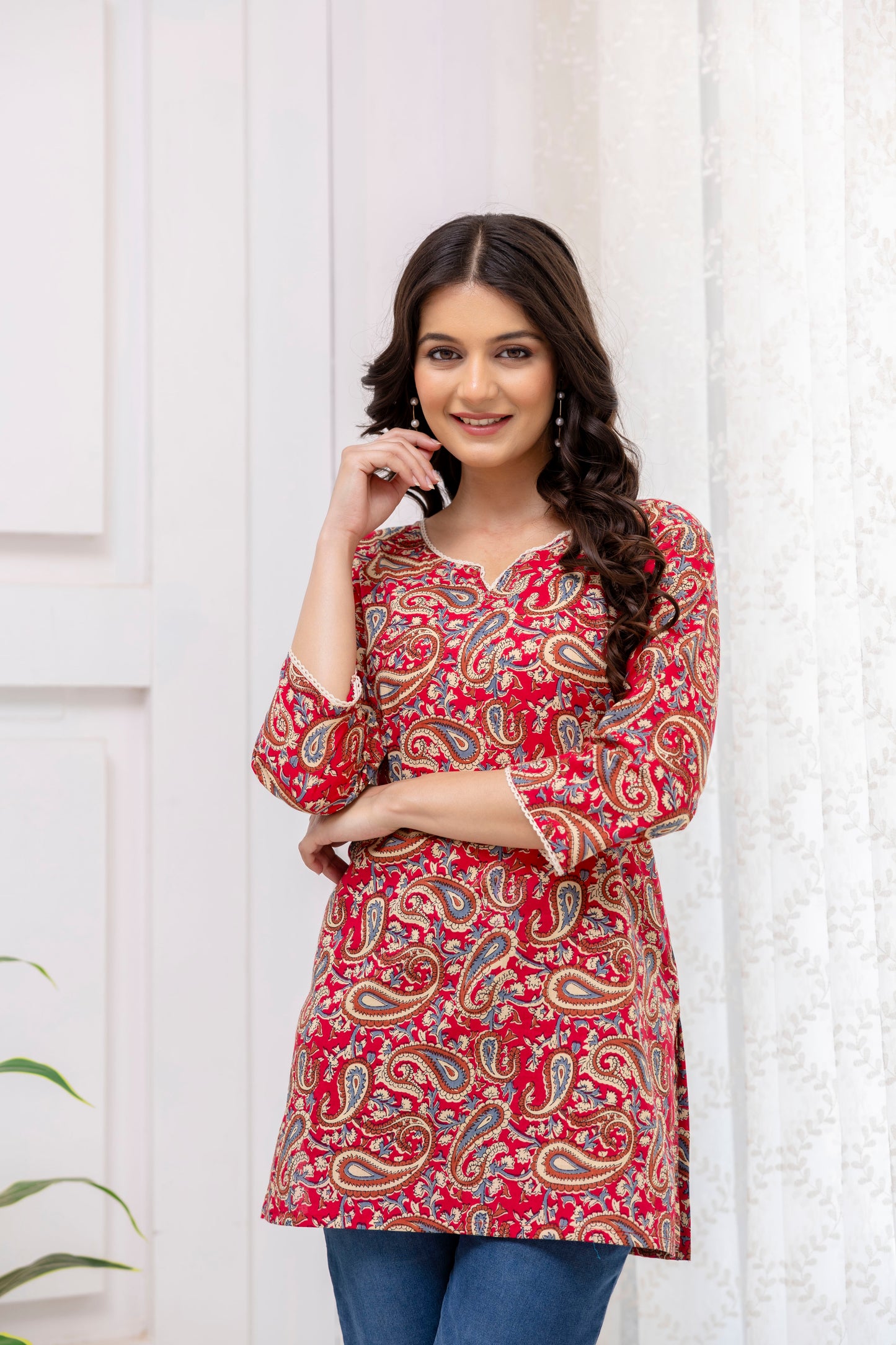Elevate your wardrobe with our Red Printed Straight Cut Short Tunic. This top features a classic round neck with a stylish V-cut, adorned with delicate lace detailing on the neck and sleeves. 3/4th sleeves and slit on sides add a touch of modern elegance to the design. Perfect for casual outings or semi-formal occasions, this short kurti combines comfort and style seamlessly, making it a versatile choice for any fashion-forward individual.