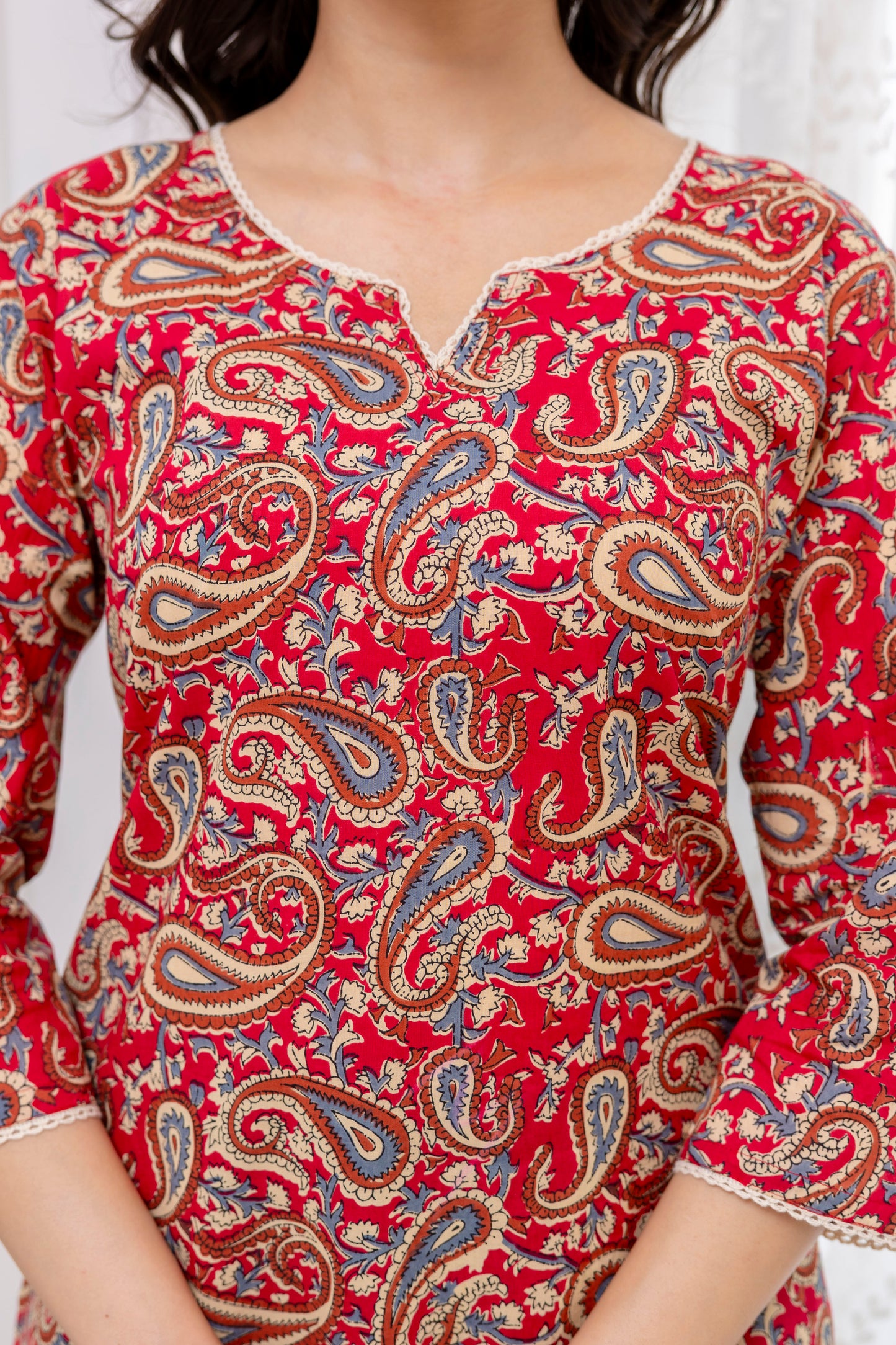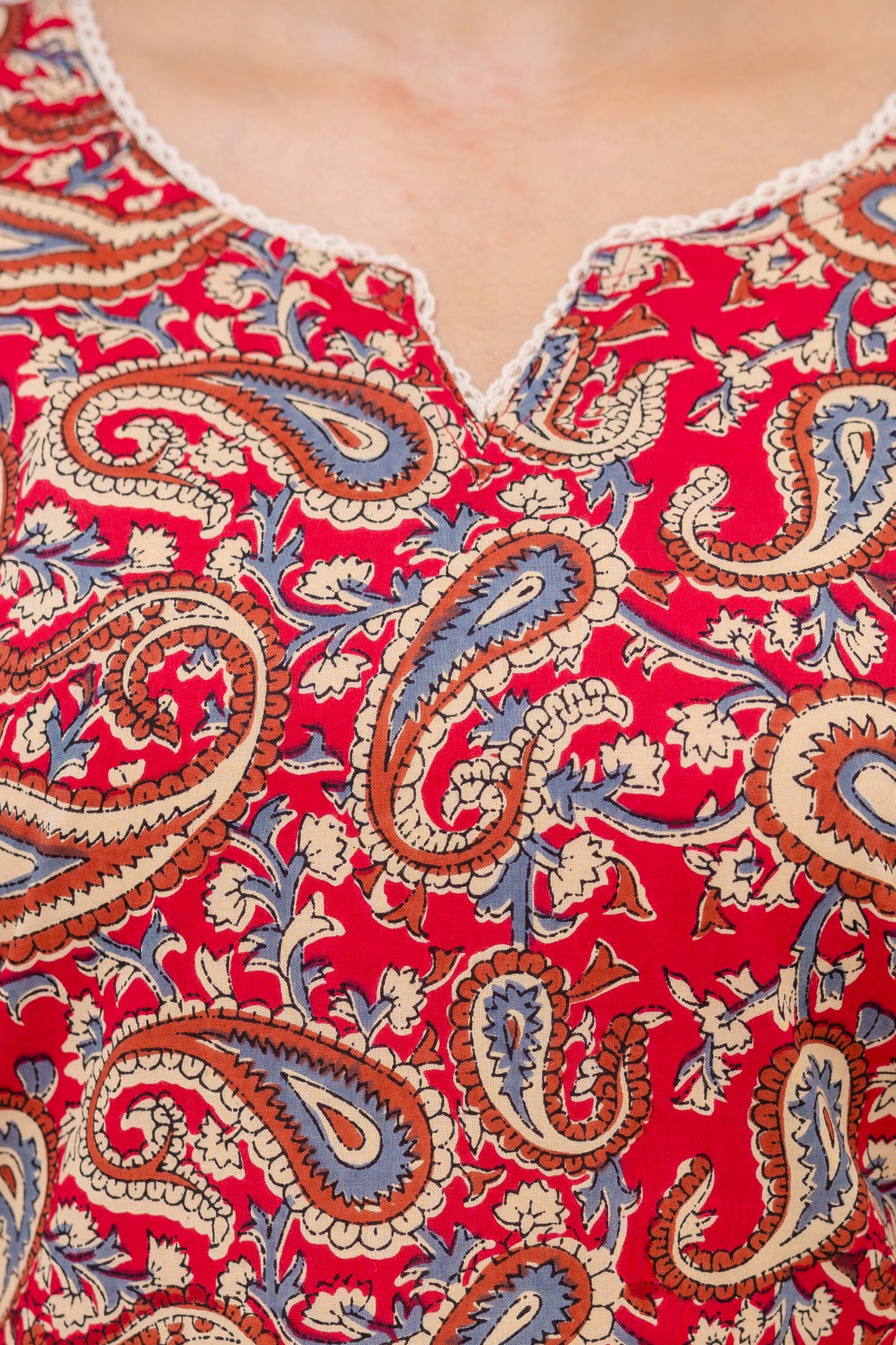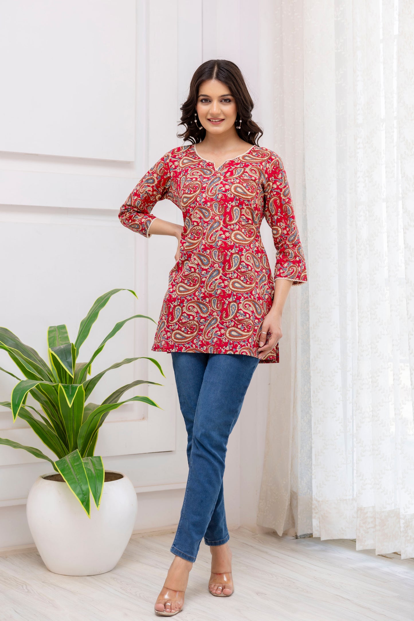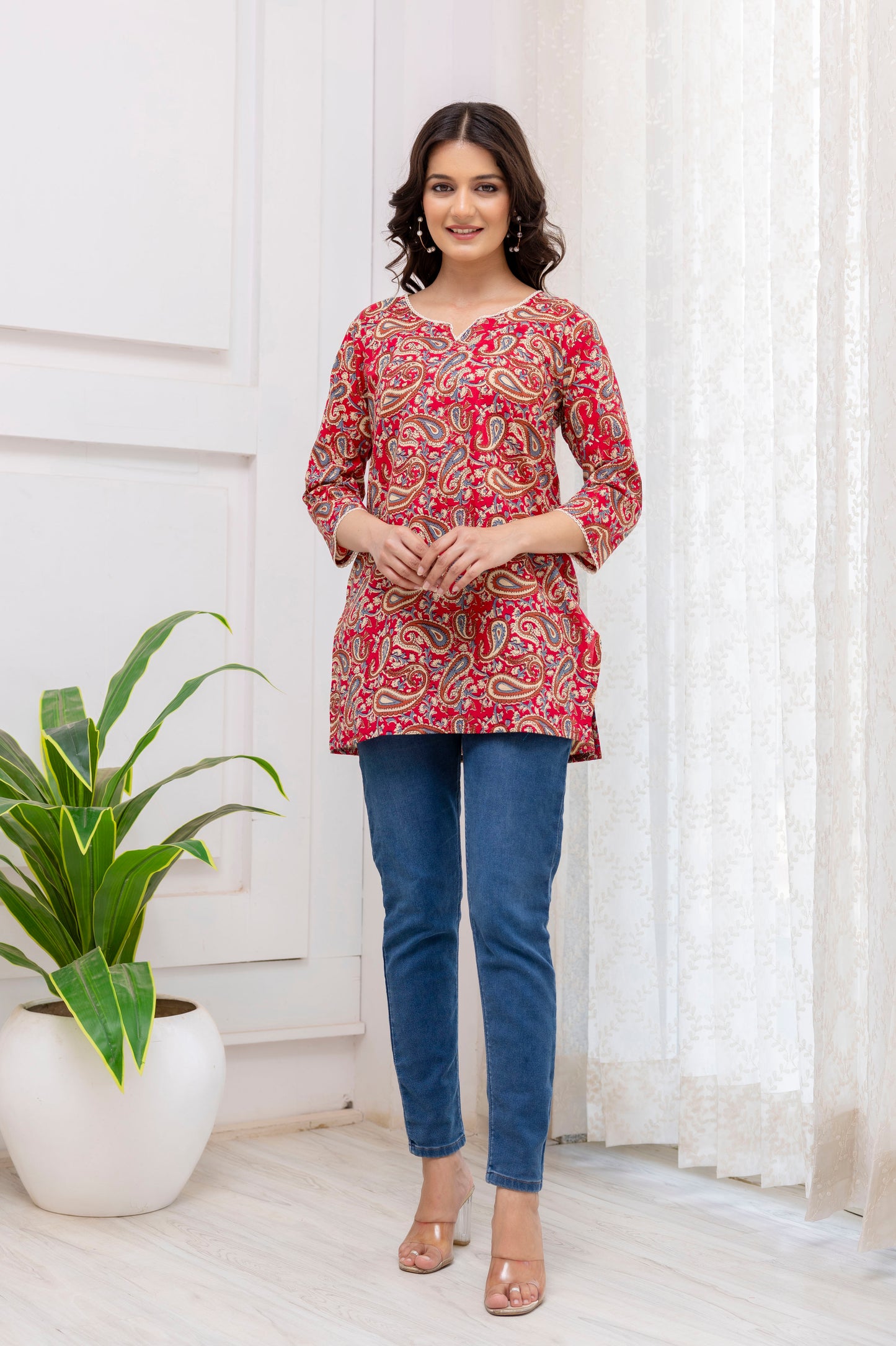 Elevate your wardrobe with our Red Printed Straight Cut Short Tunic. This top features a classic round neck with a stylish V-cut, adorned with delicate lace detailing on the neck and sleeves. 3/4th sleeves and slit on sides add a touch of modern elegance to the design. Perfect for casual outings or semi-formal occasions, this short kurti combines comfort and style seamlessly, making it a versatile choice for any fashion-forward individual.