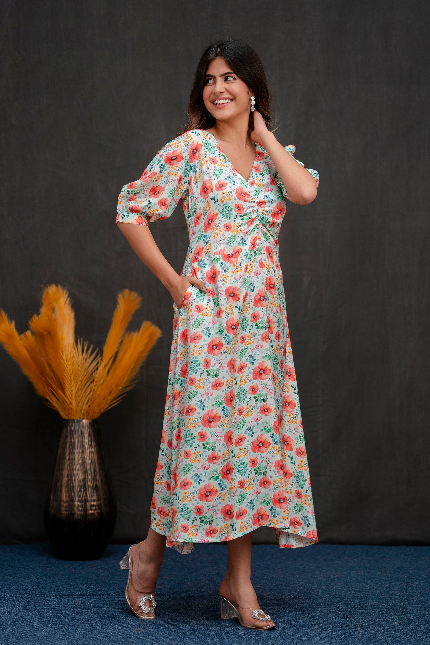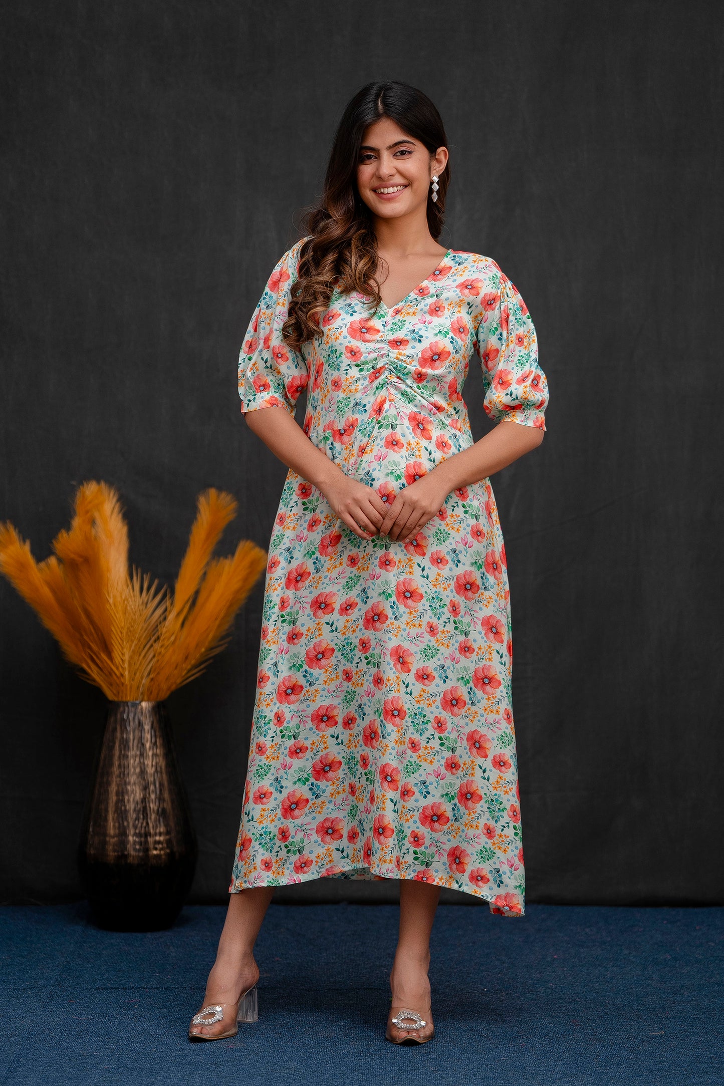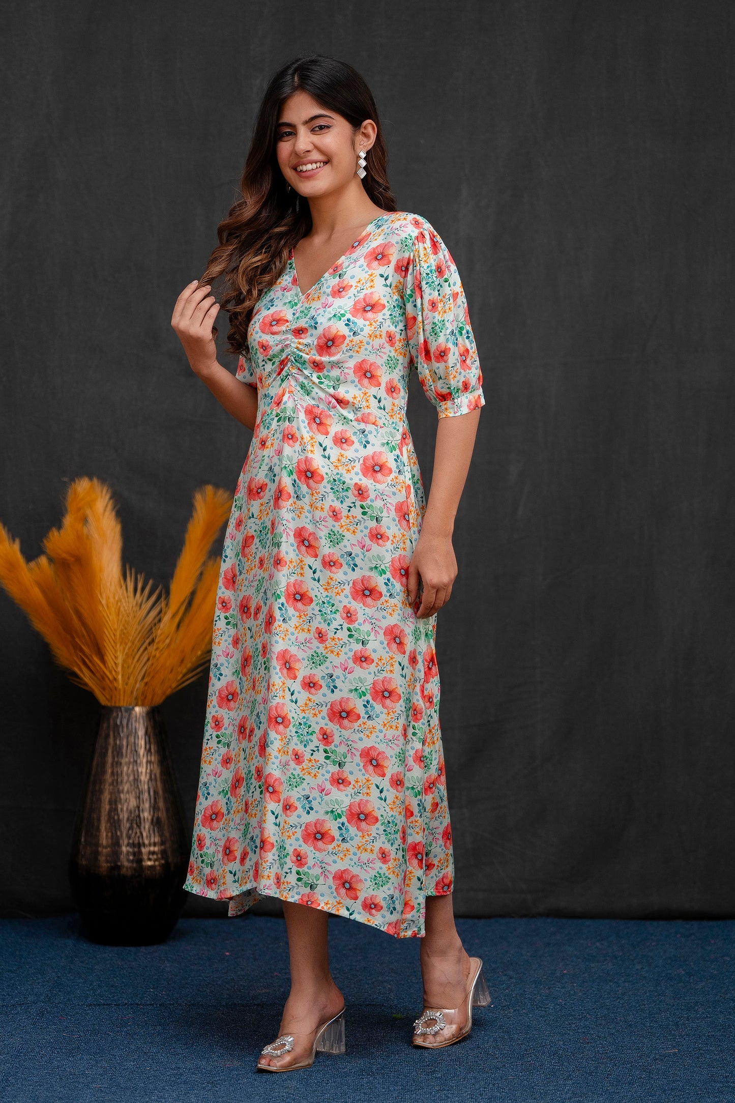 Beauty comes in various forms and this A-Line dress embodies the concept of being "pretty". Created using the finest muslin material, this stunning dress features an intricate overlay of red feminine floral prints and V-Neck with gathers at the front adding up to the feminine charm. Elbow sleeves with cuff and gather detailing is enhancing the look. The pastel hues adorned with a delicate floral print makes it an ideal choice for daytime events and parties.