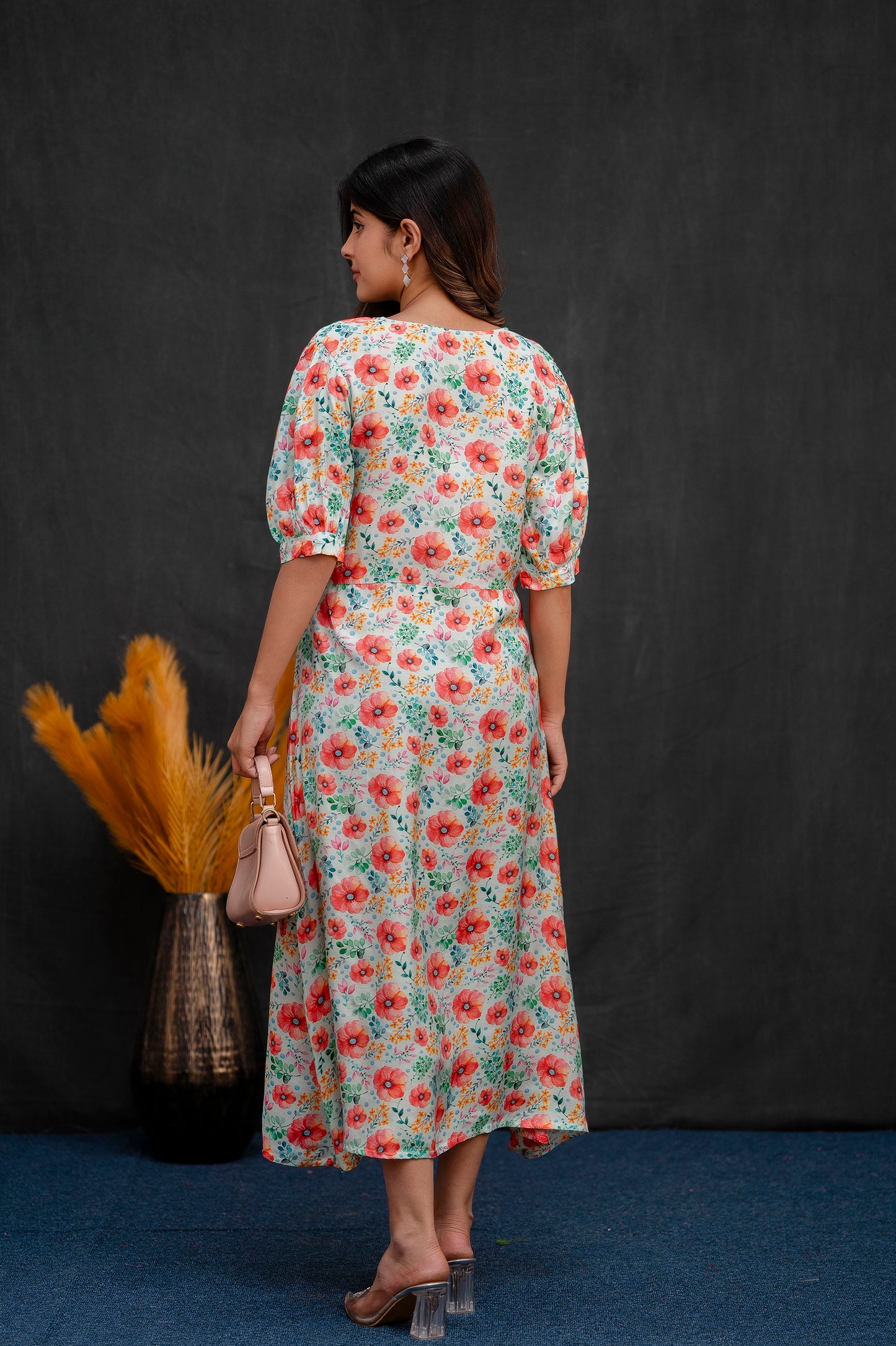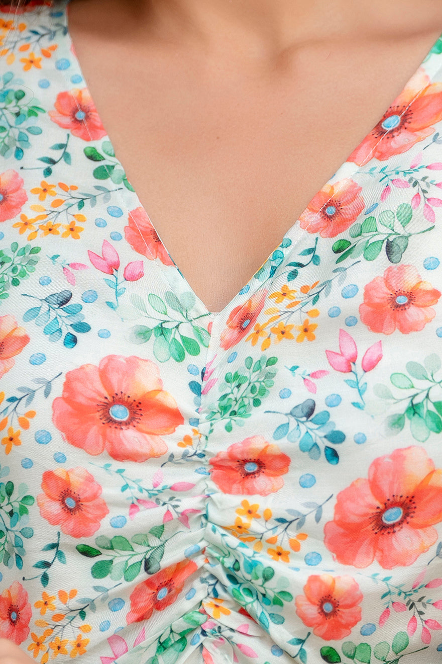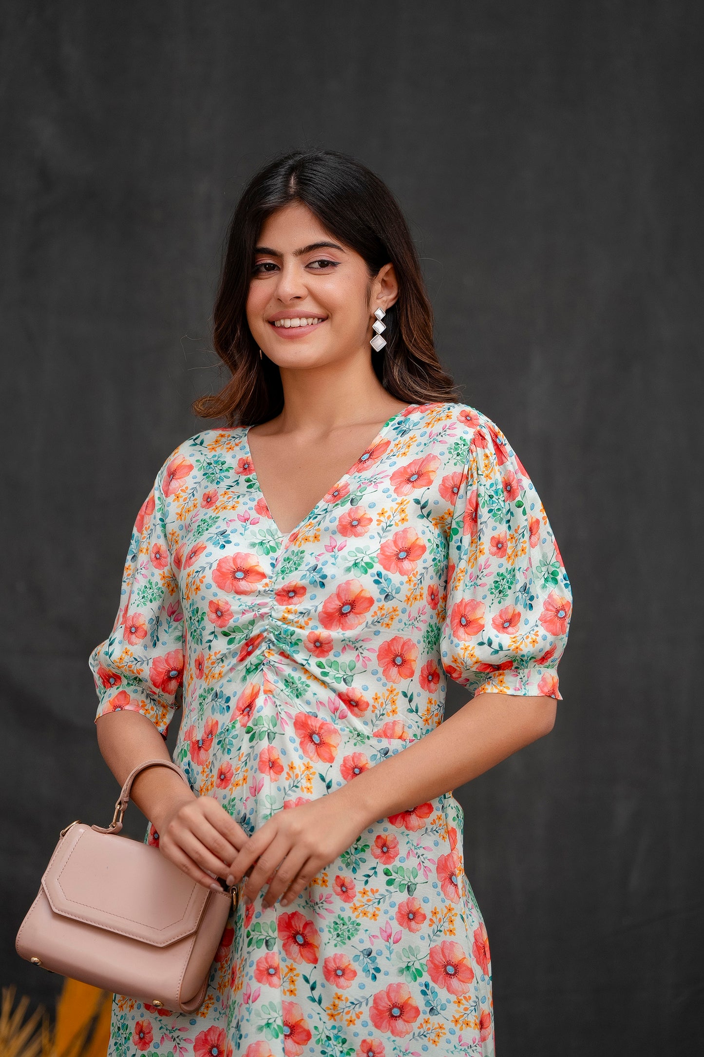 Beauty comes in various forms and this A-Line dress embodies the concept of being "pretty". Created using the finest muslin material, this stunning dress features an intricate overlay of red feminine floral prints and V-Neck with gathers at the front adding up to the feminine charm. Elbow sleeves with cuff and gather detailing is enhancing the look. The pastel hues adorned with a delicate floral print makes it an ideal choice for daytime events and parties.