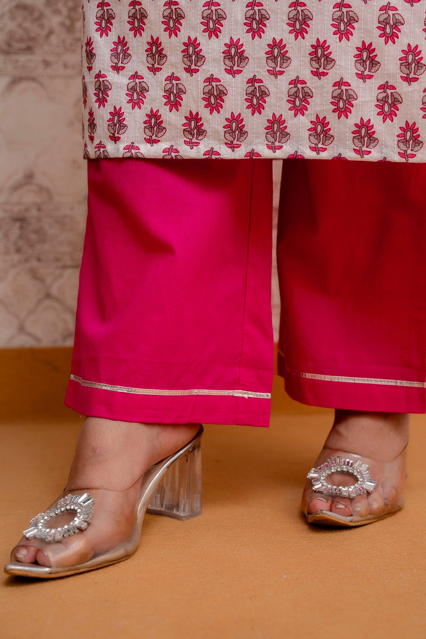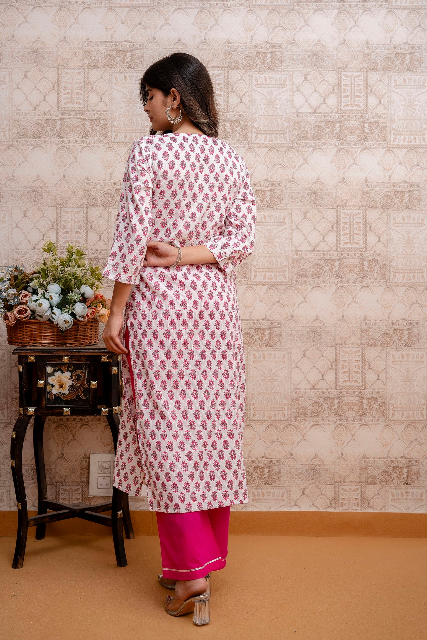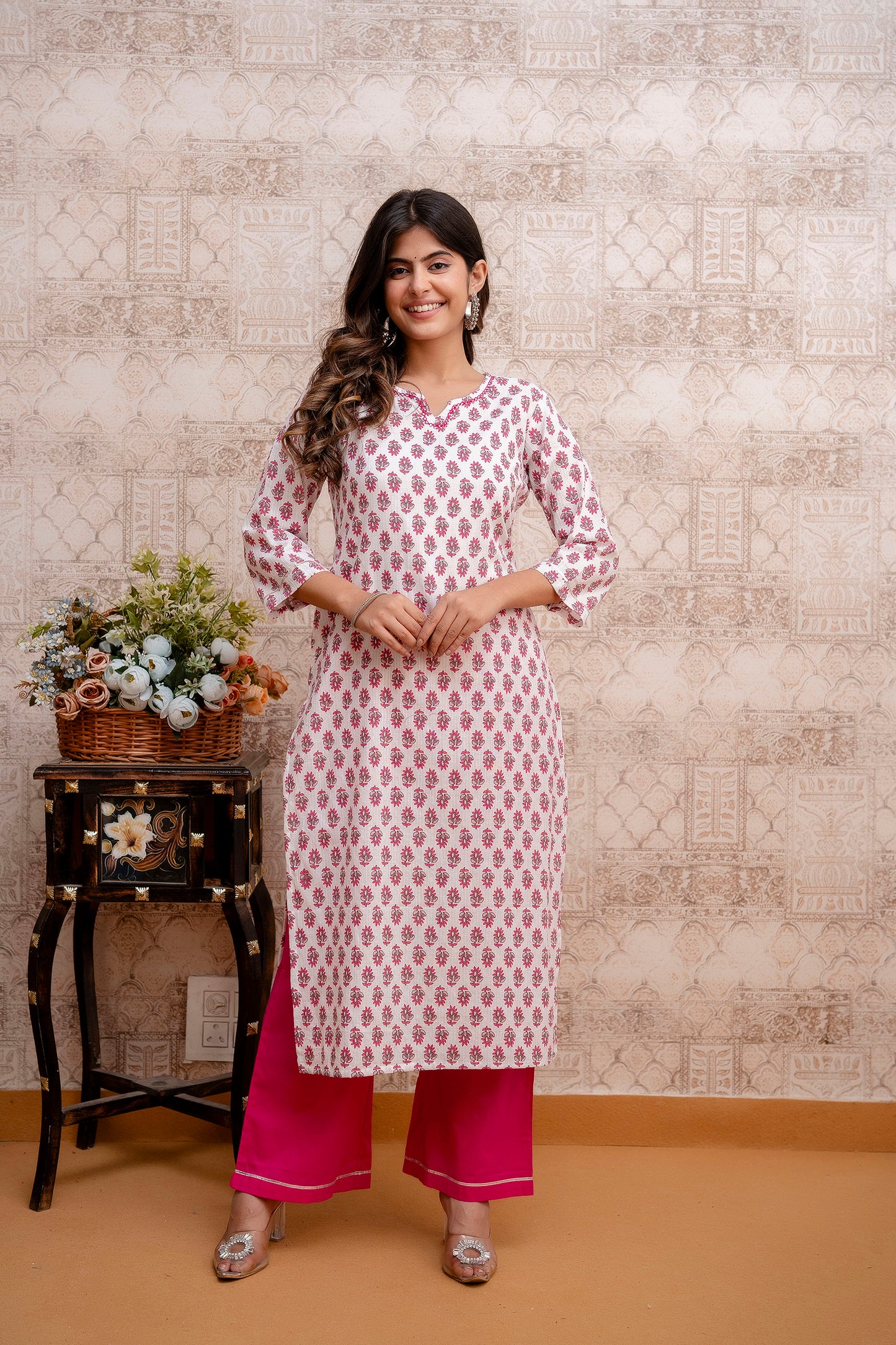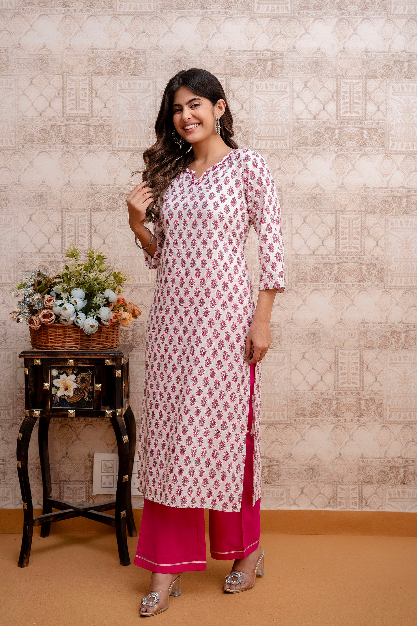 Elevate your ethnic style with this enchanting white printed self weaving cotton kurta pant Set. The straight fit kurta has round V-neck and hand-embroidered sequins work along with 3/4th sleeves highlighted with gota. The set is complete with solid pink color pants having fully elasticated waistband and gota detailing at the bottom.This cotton kurta pant set is perfect for diverse occasions and combines style, comfort and practicality in one ensemble.