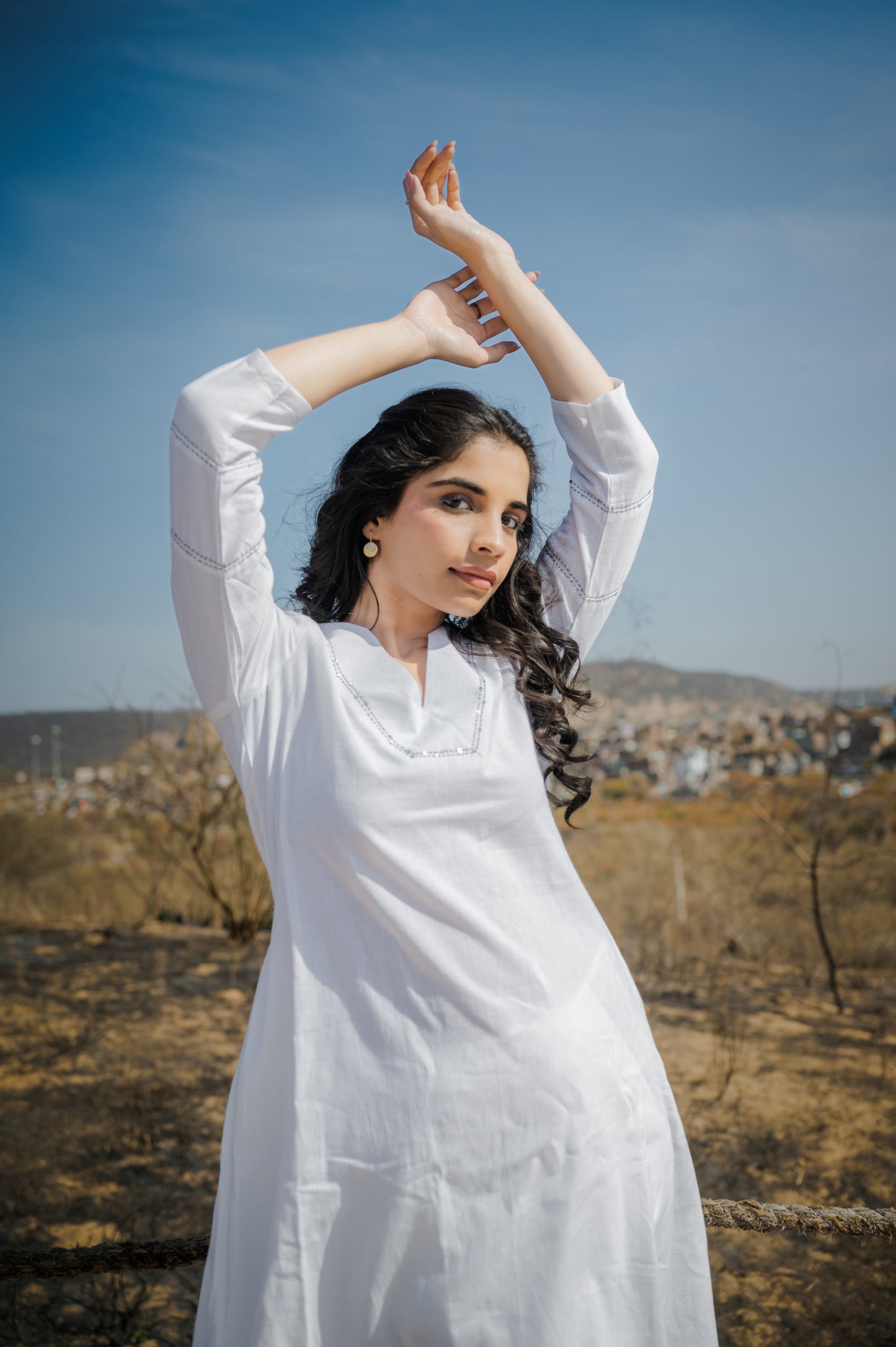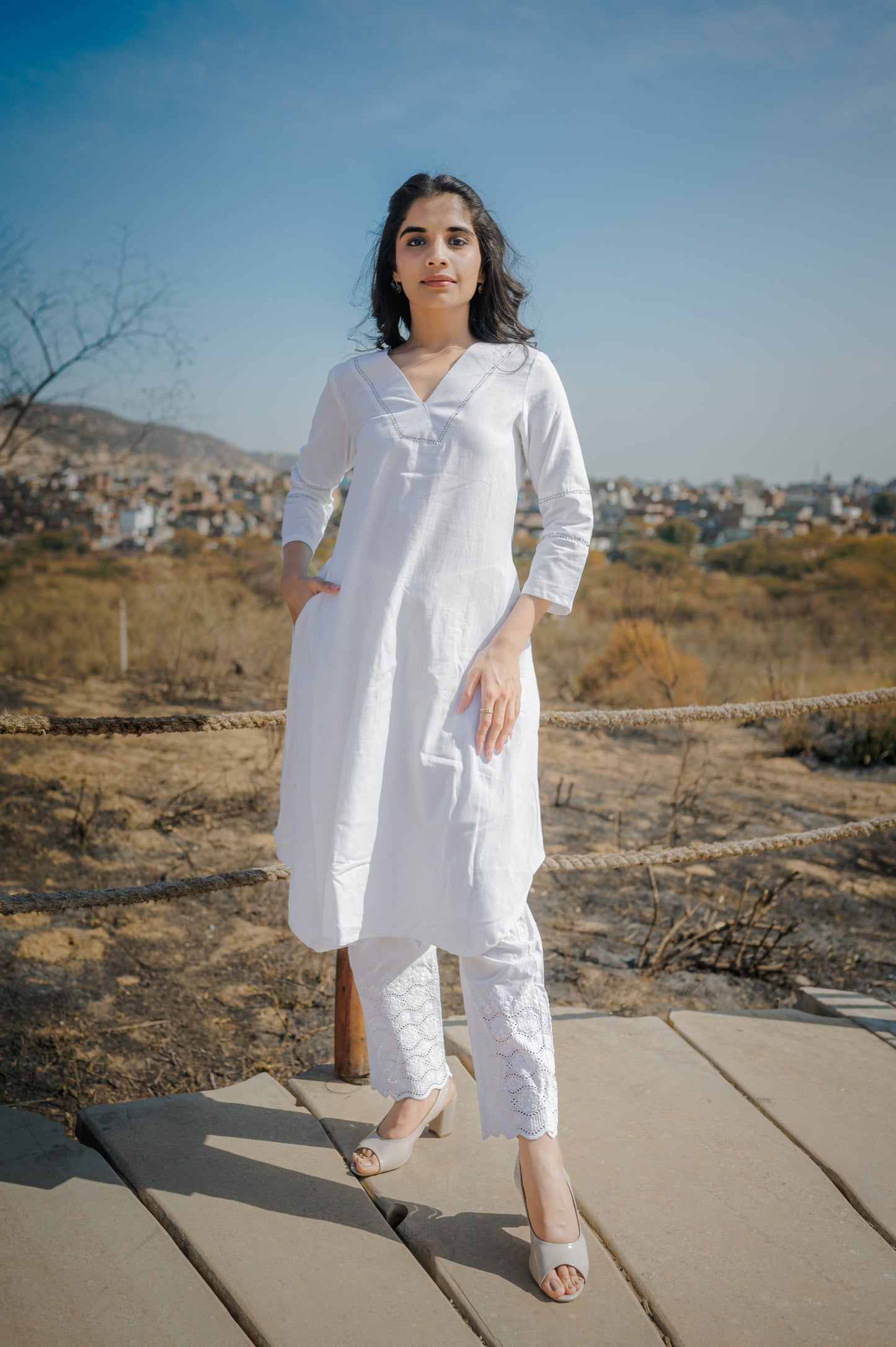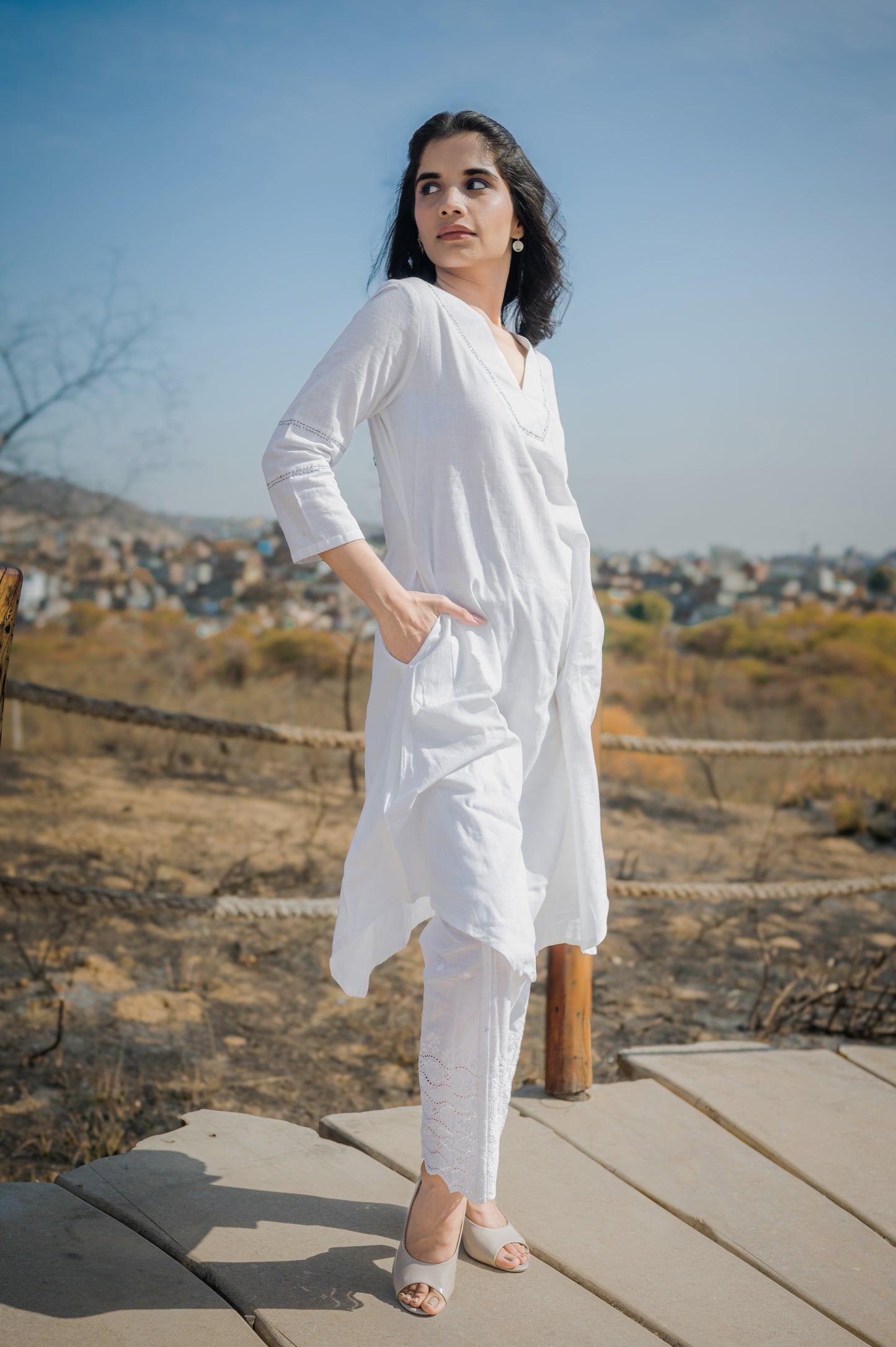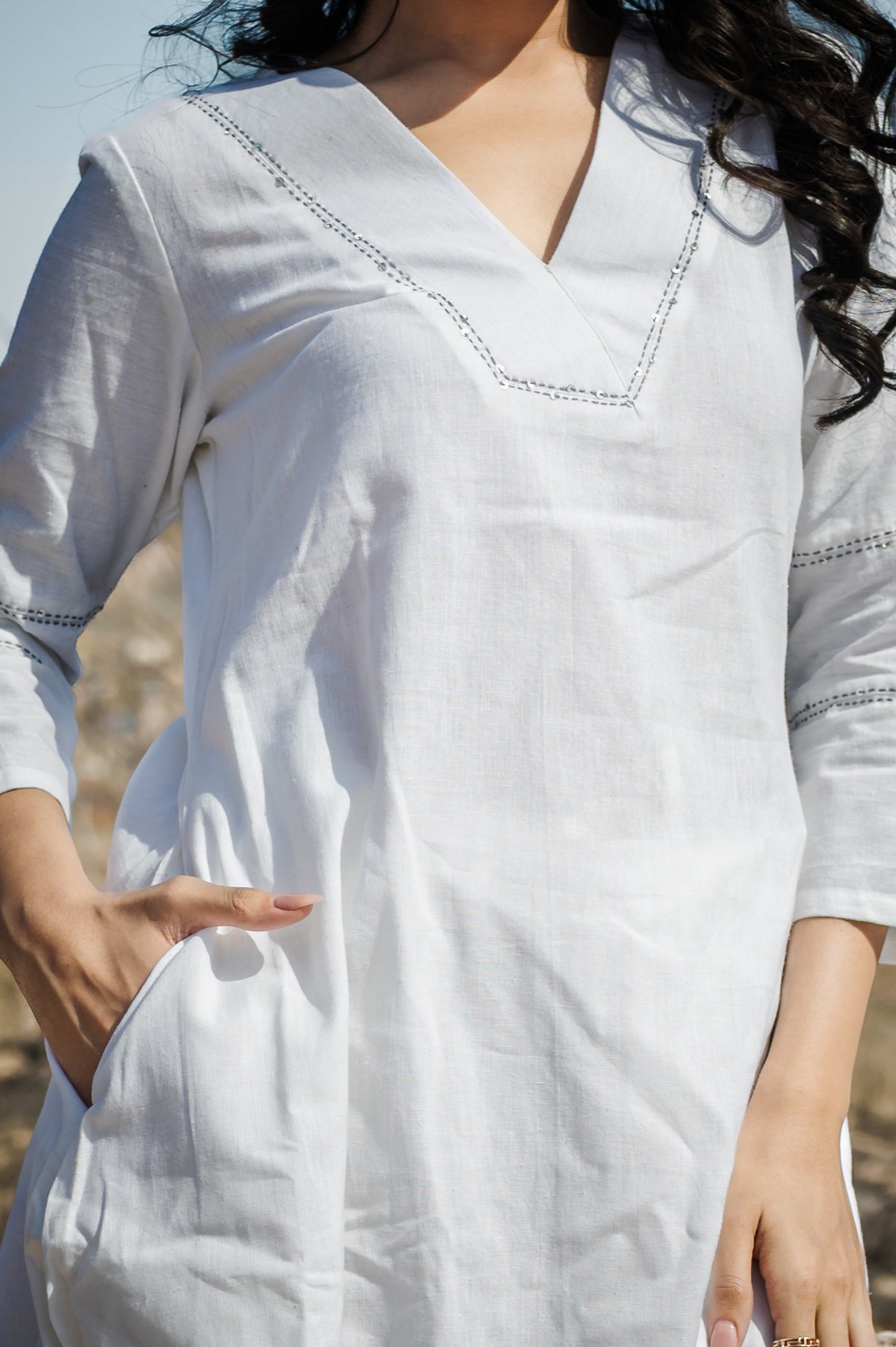 Introducing our sophisticated White solid symmetric kurta, meticulously crafted to elevate your style. Adorned with exquisite patch and handwork detailing along the V-neckline, this kurta exudes elegance and charm. The V-neck has patch and kantha work detailing, adding an extra layer of artisanal flair to the design. The 3/4th sleeves feature a captivating patch in the middle, embellished with intricate kantha work, adding a touch of artisanal flair to the design.With two convenient side pockets. Pair it effortlessly with our pants for a complete ensemble that exudes sophistication and grace. Make a statement wherever you go with this timeless and versatile kurta.