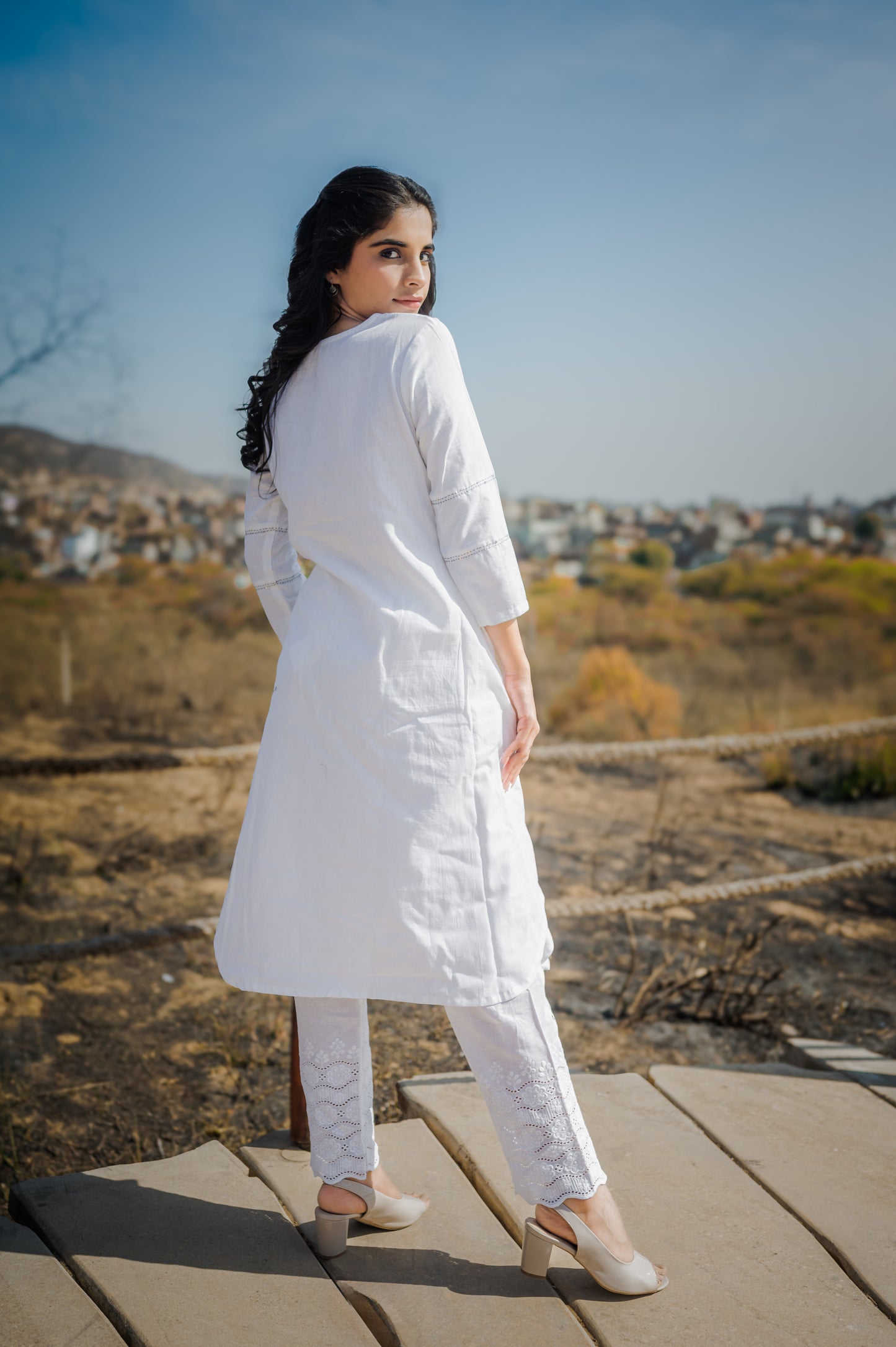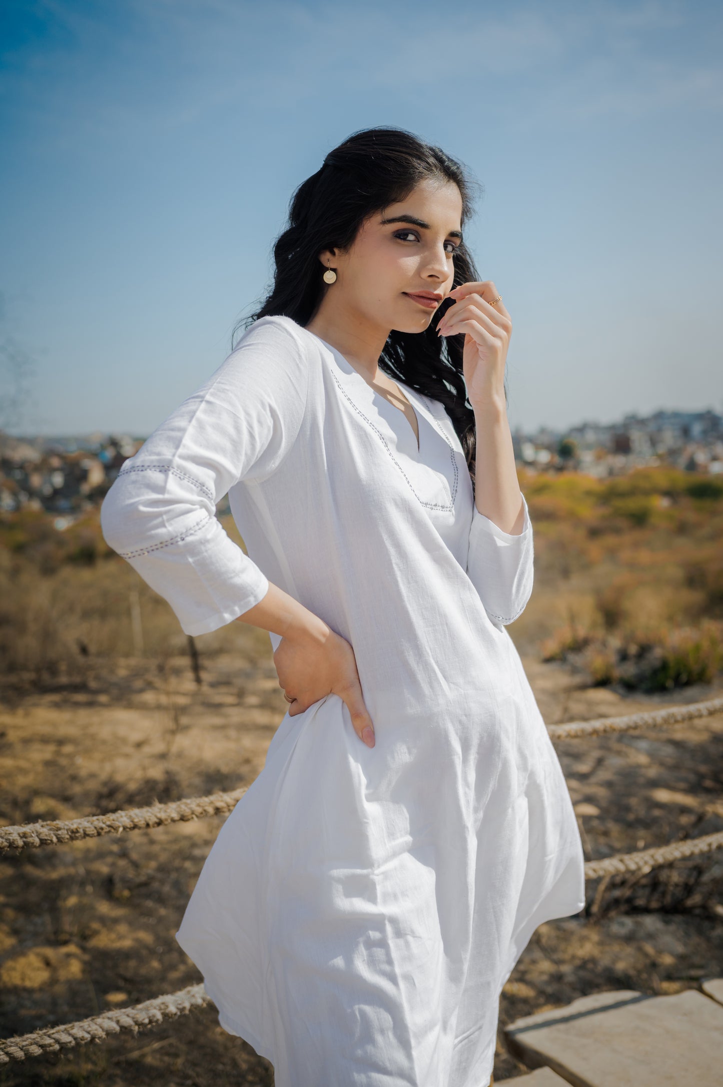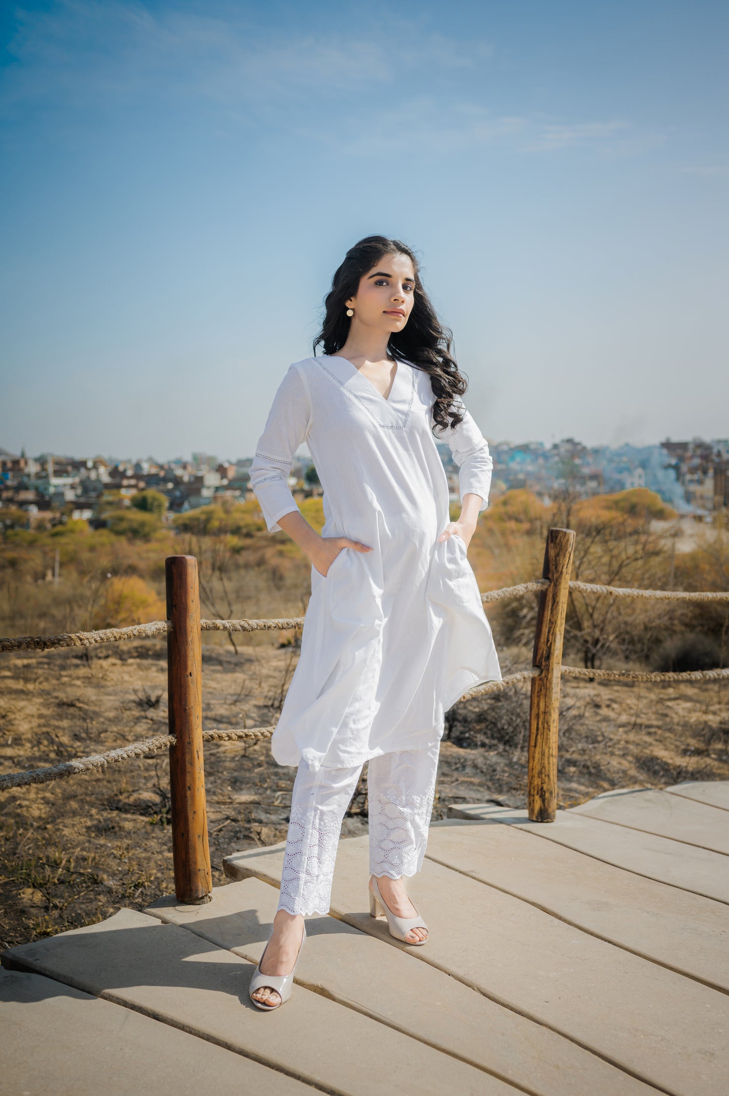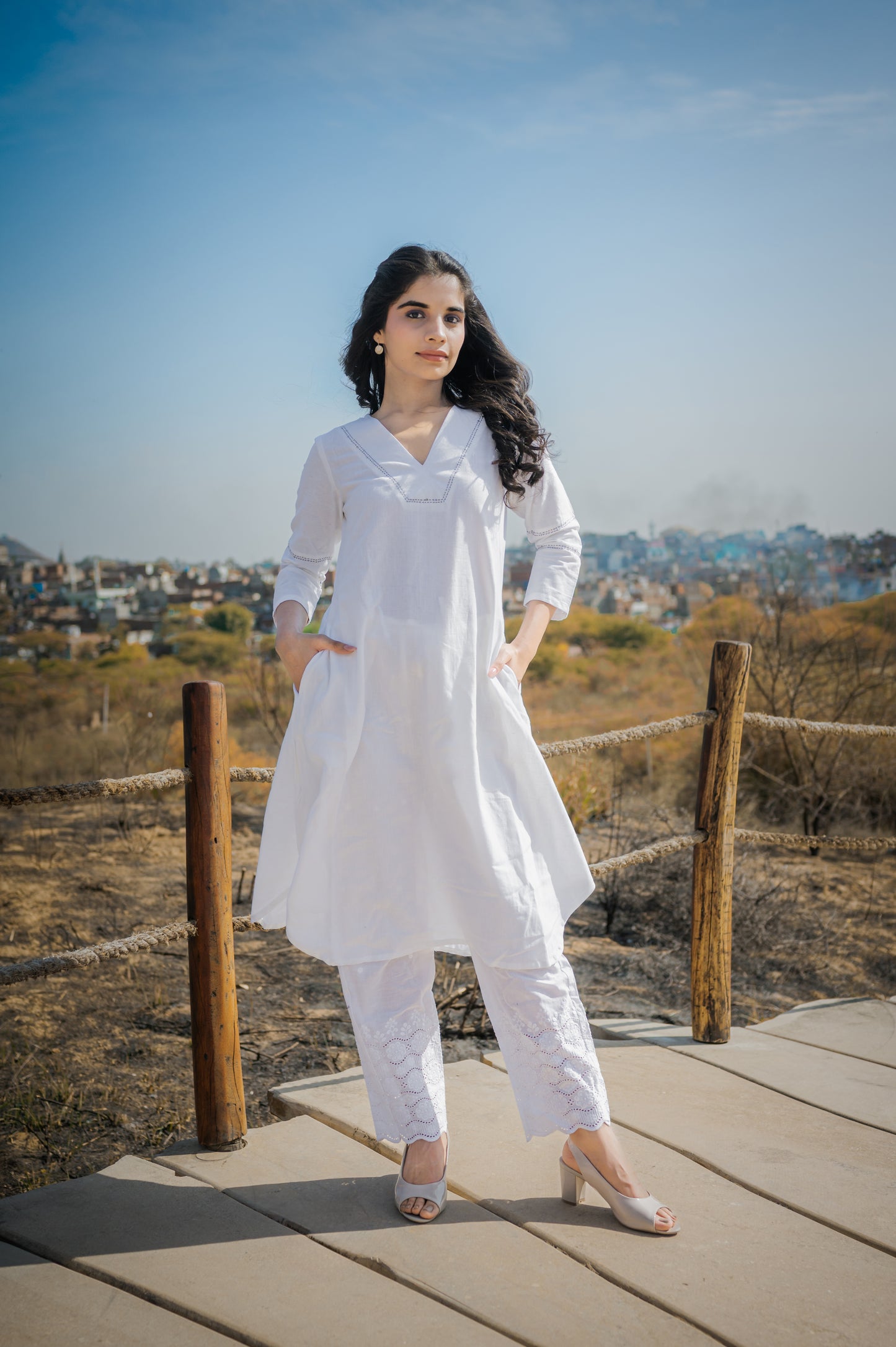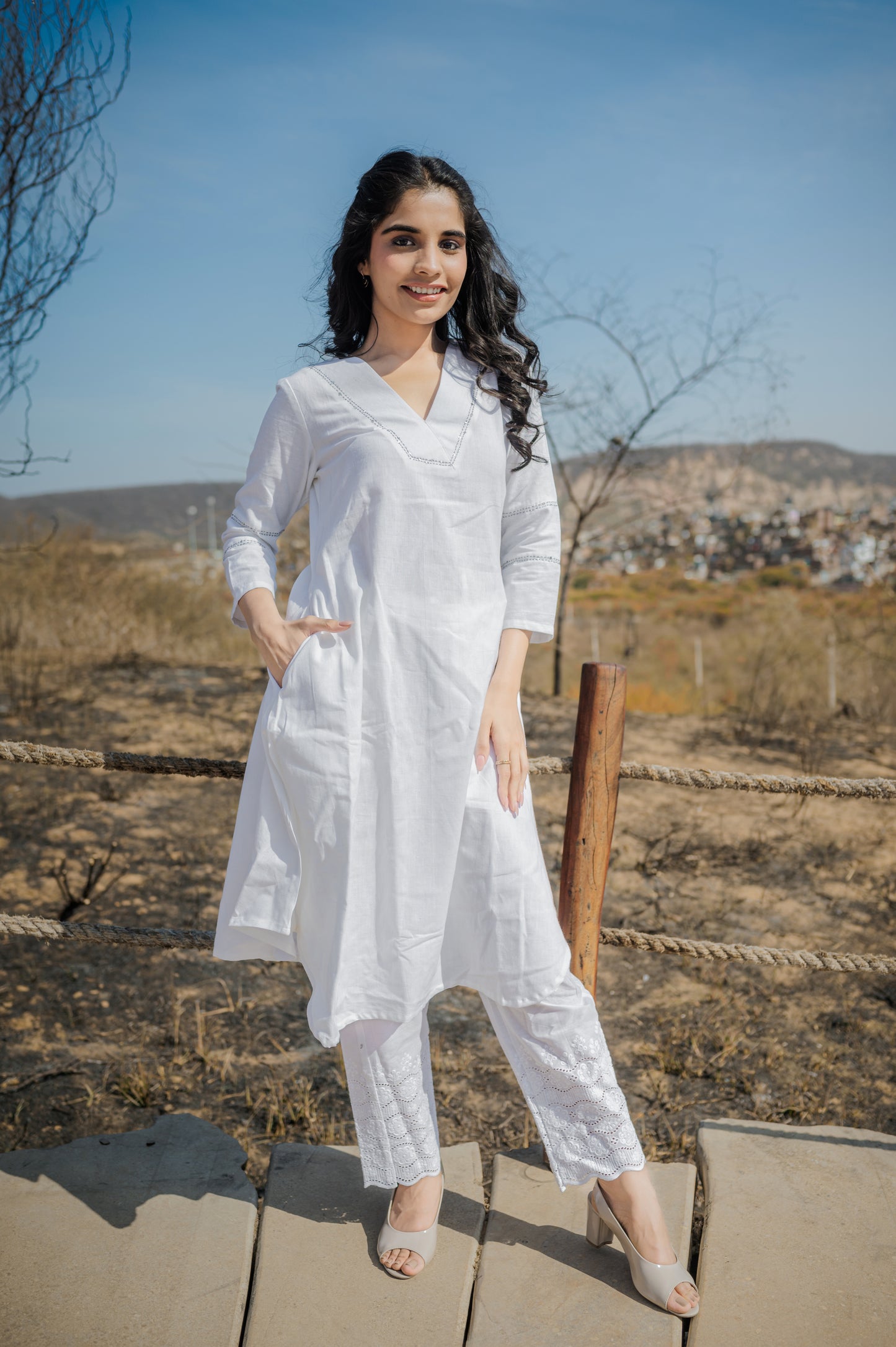 Introducing our sophisticated White solid symmetric kurta, meticulously crafted to elevate your style. Adorned with exquisite patch and handwork detailing along the V-neckline, this kurta exudes elegance and charm. The V-neck has patch and kantha work detailing, adding an extra layer of artisanal flair to the design. The 3/4th sleeves feature a captivating patch in the middle, embellished with intricate kantha work, adding a touch of artisanal flair to the design.With two convenient side pockets. Pair it effortlessly with our pants for a complete ensemble that exudes sophistication and grace. Make a statement wherever you go with this timeless and versatile kurta.