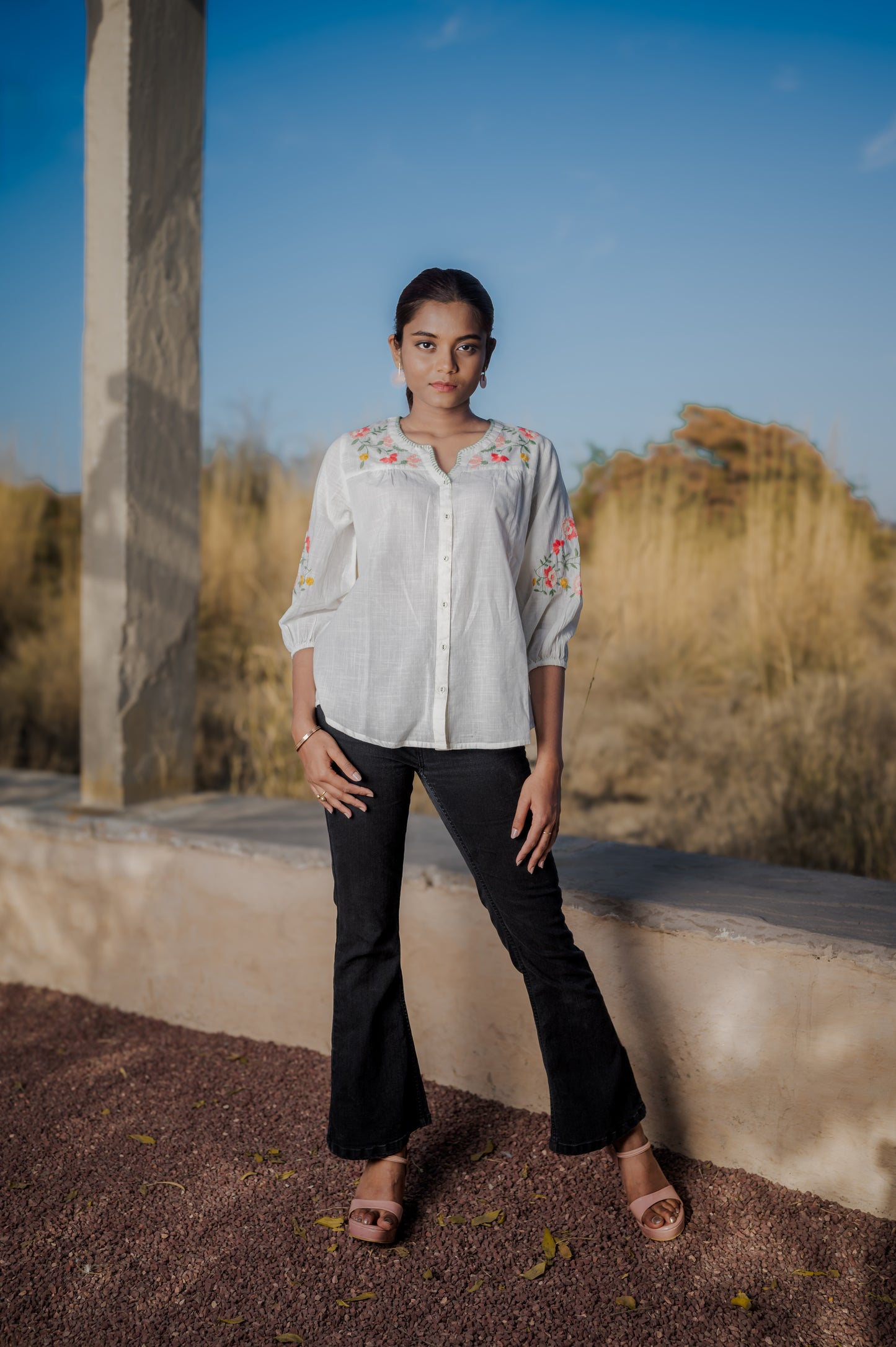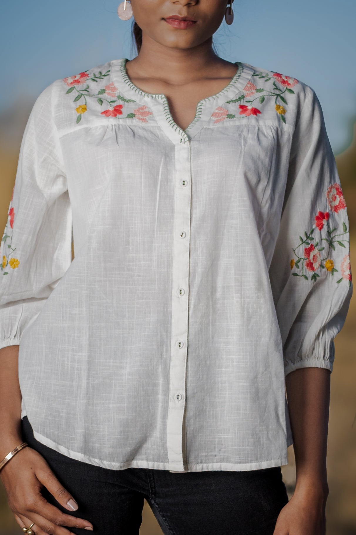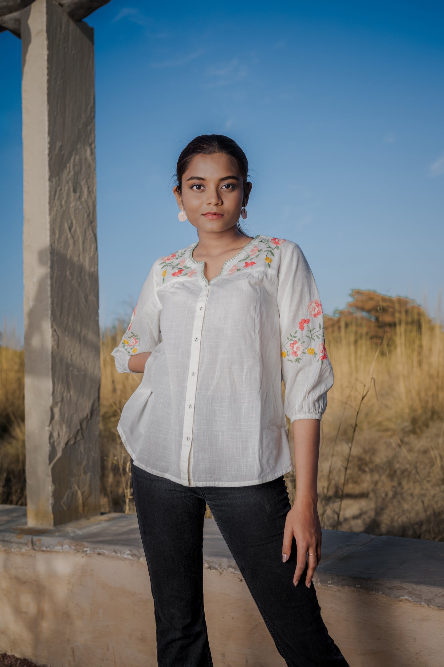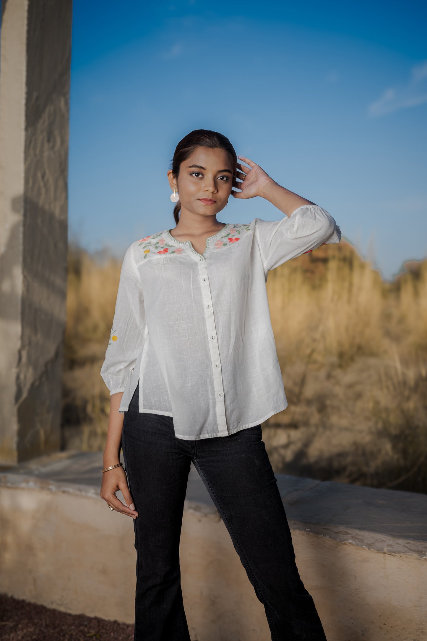 This white embroidered cotton top exudes sophistication with its floral embroidery gracing the upper yoke and sleeves. The round V-neck features intricate handiwork detailing along the functional buttoned placket, adding both elegance and functionality. Subtle front gathers create a flattering silhouette, while the 3/4th sleeves with elasticated cuffs offer comfort and style. Crafted from high-quality cotton fabric, this top is a timeless addition to any wardrobe, seamlessly blending intricate design with modern sensibility. paired with jeans for a casual outing or dressed up with our pants or a more formal occasion.