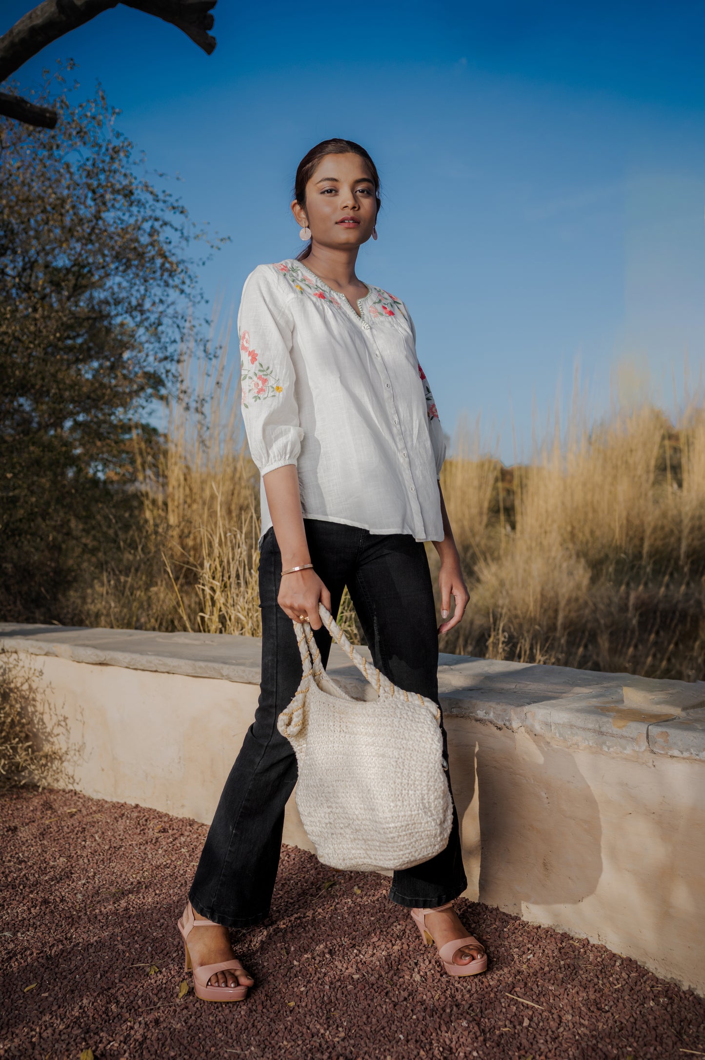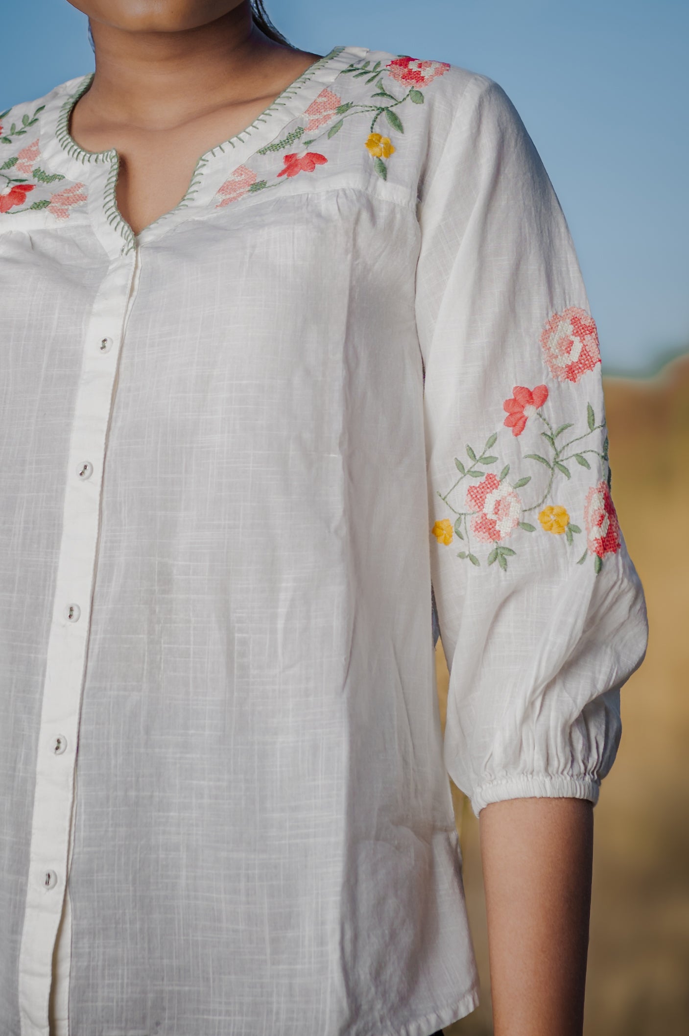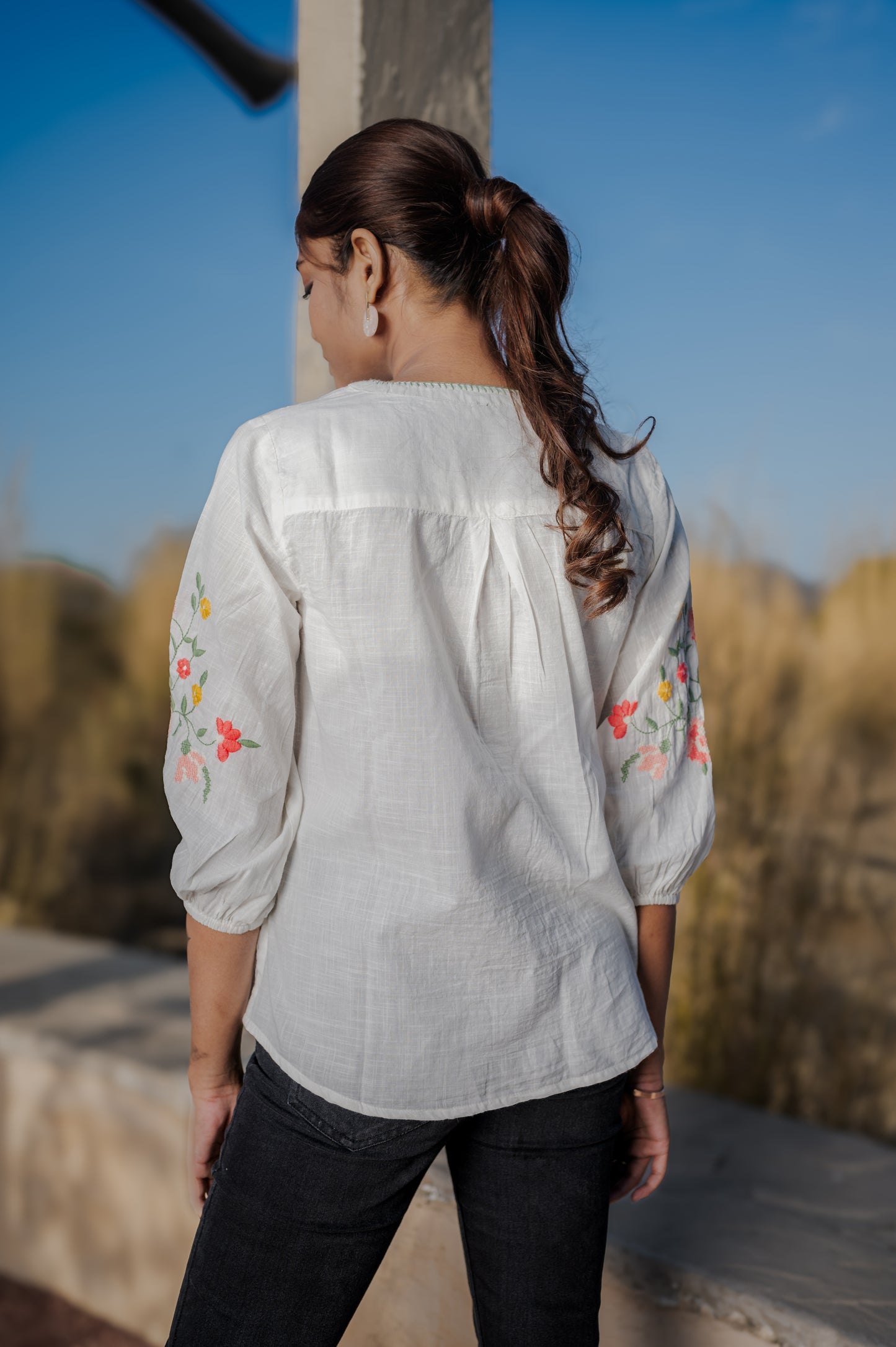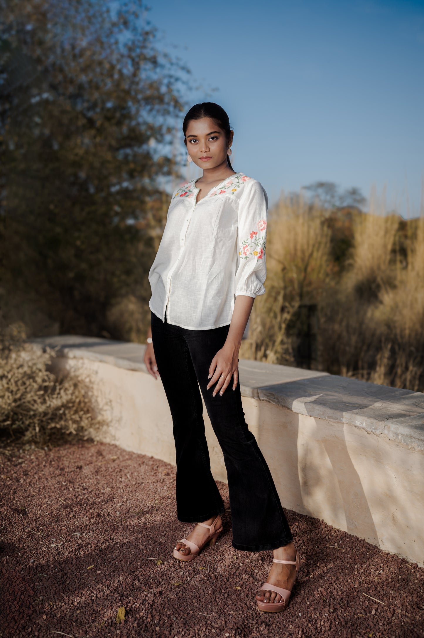 This white embroidered cotton top exudes sophistication with its floral embroidery gracing the upper yoke and sleeves. The round V-neck features intricate handiwork detailing along the functional buttoned placket, adding both elegance and functionality. Subtle front gathers create a flattering silhouette, while the 3/4th sleeves with elasticated cuffs offer comfort and style. Crafted from high-quality cotton fabric, this top is a timeless addition to any wardrobe, seamlessly blending intricate design with modern sensibility. paired with jeans for a casual outing or dressed up with our pants or a more formal occasion.
