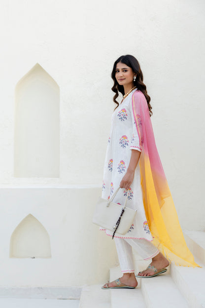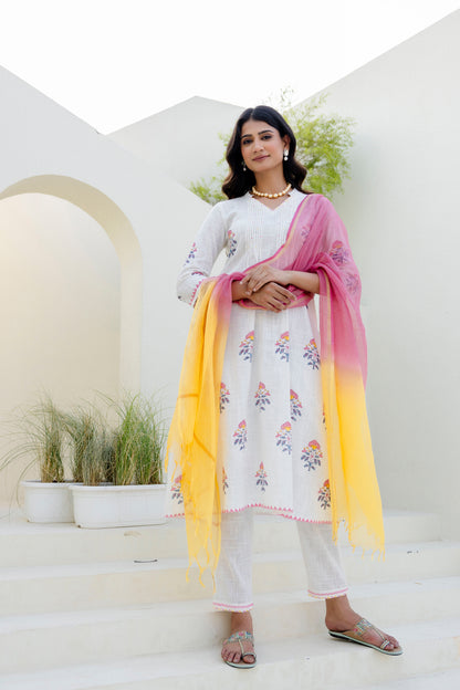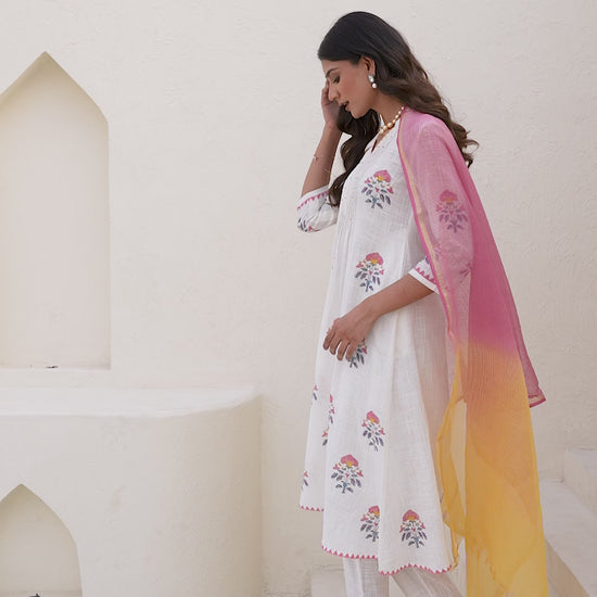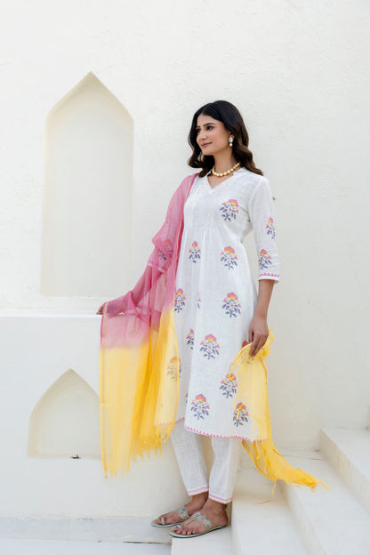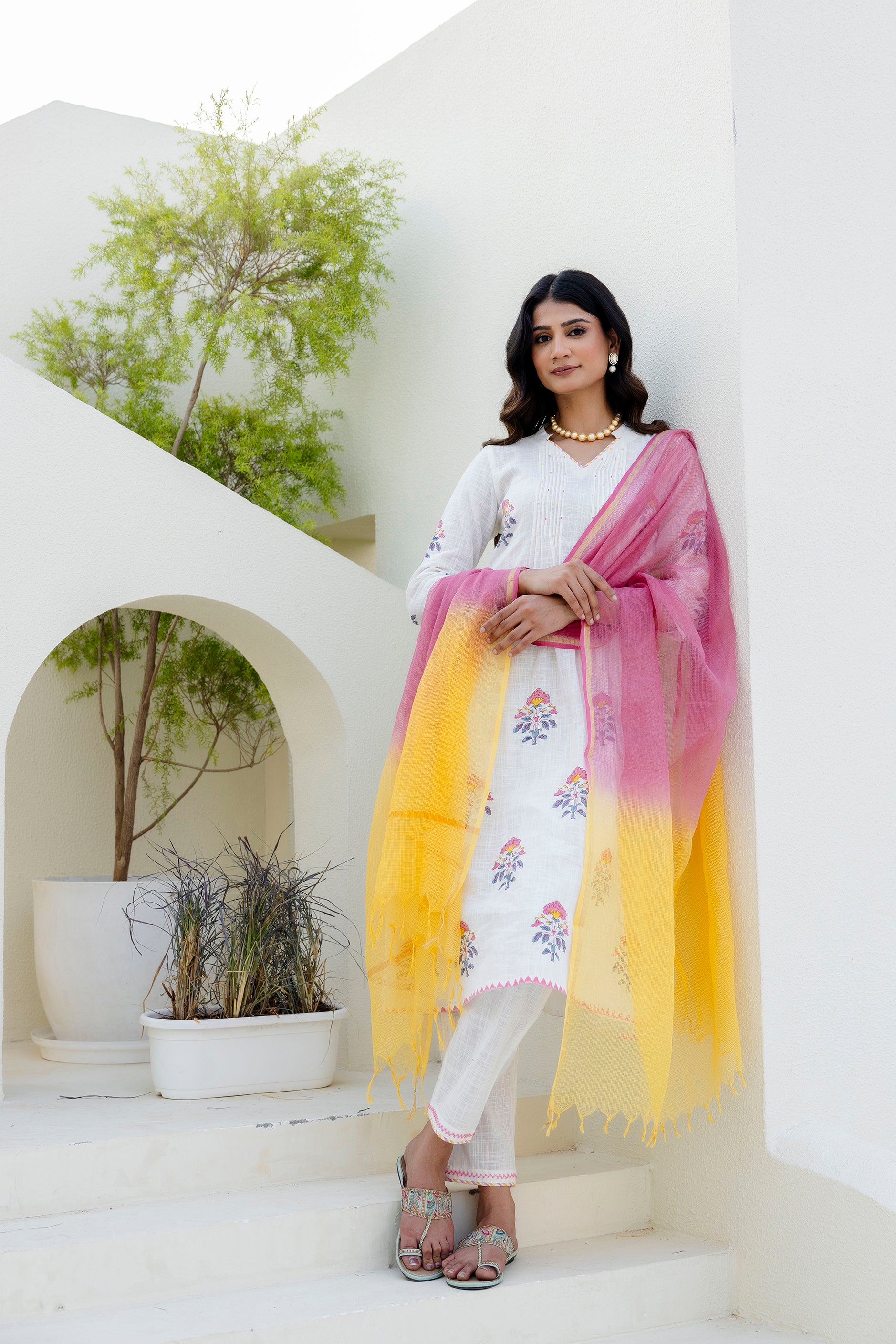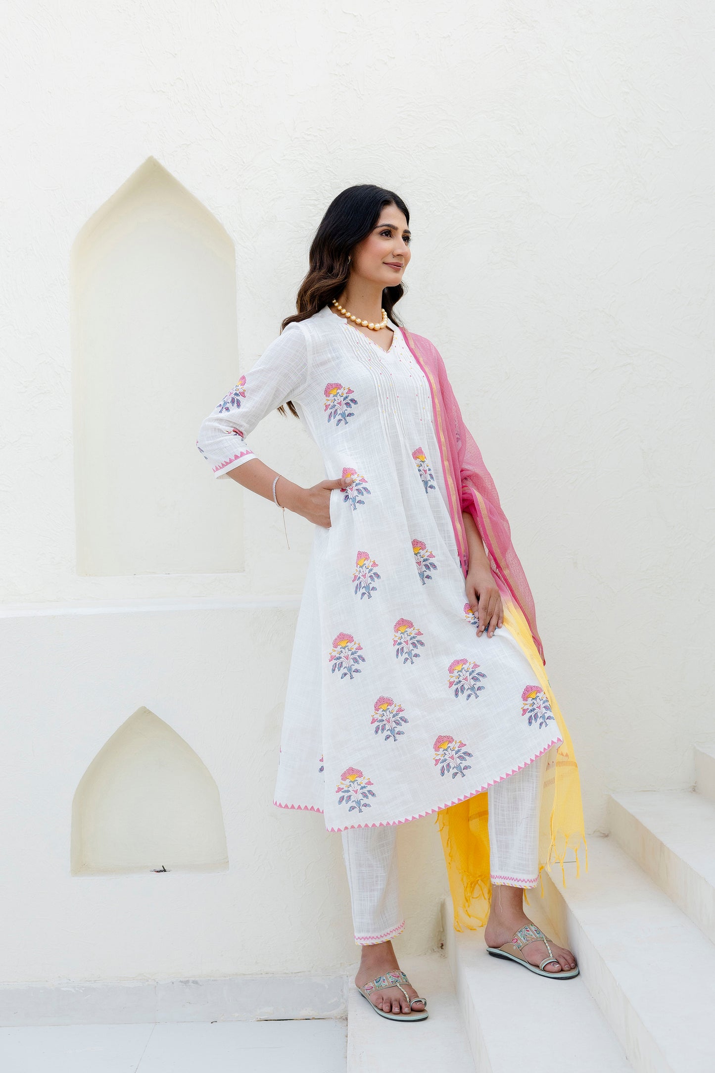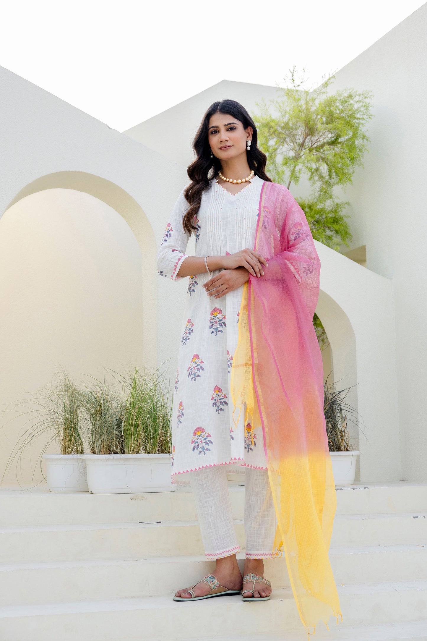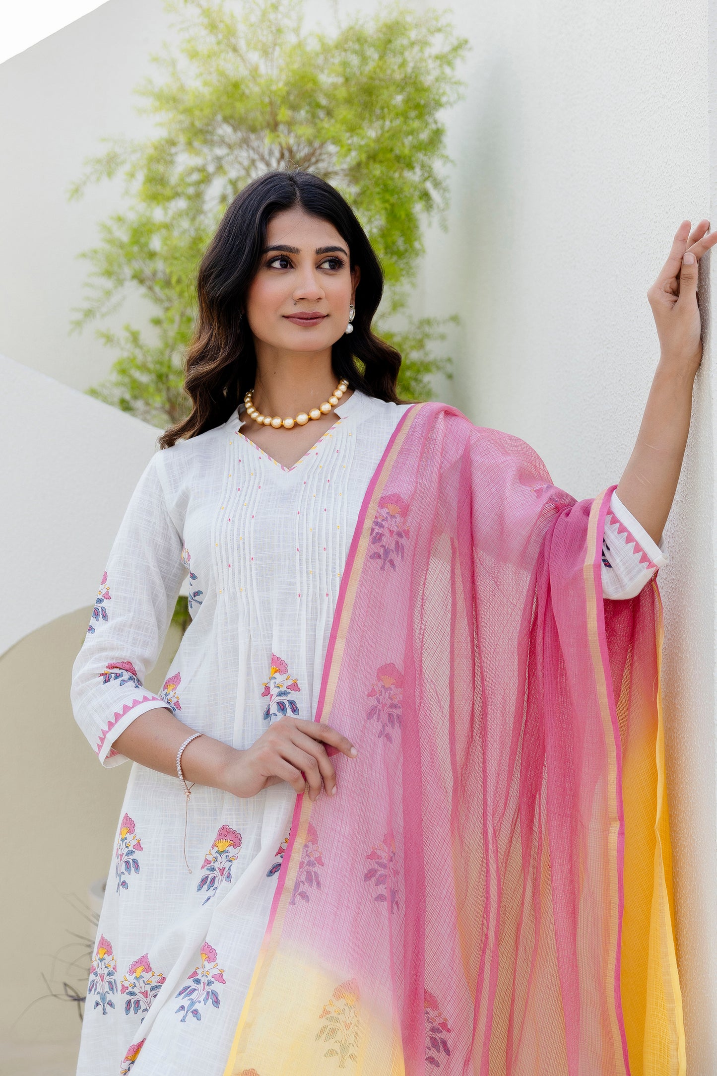 White Slub Cotton Handblock Print Kurta Pant Dupatta