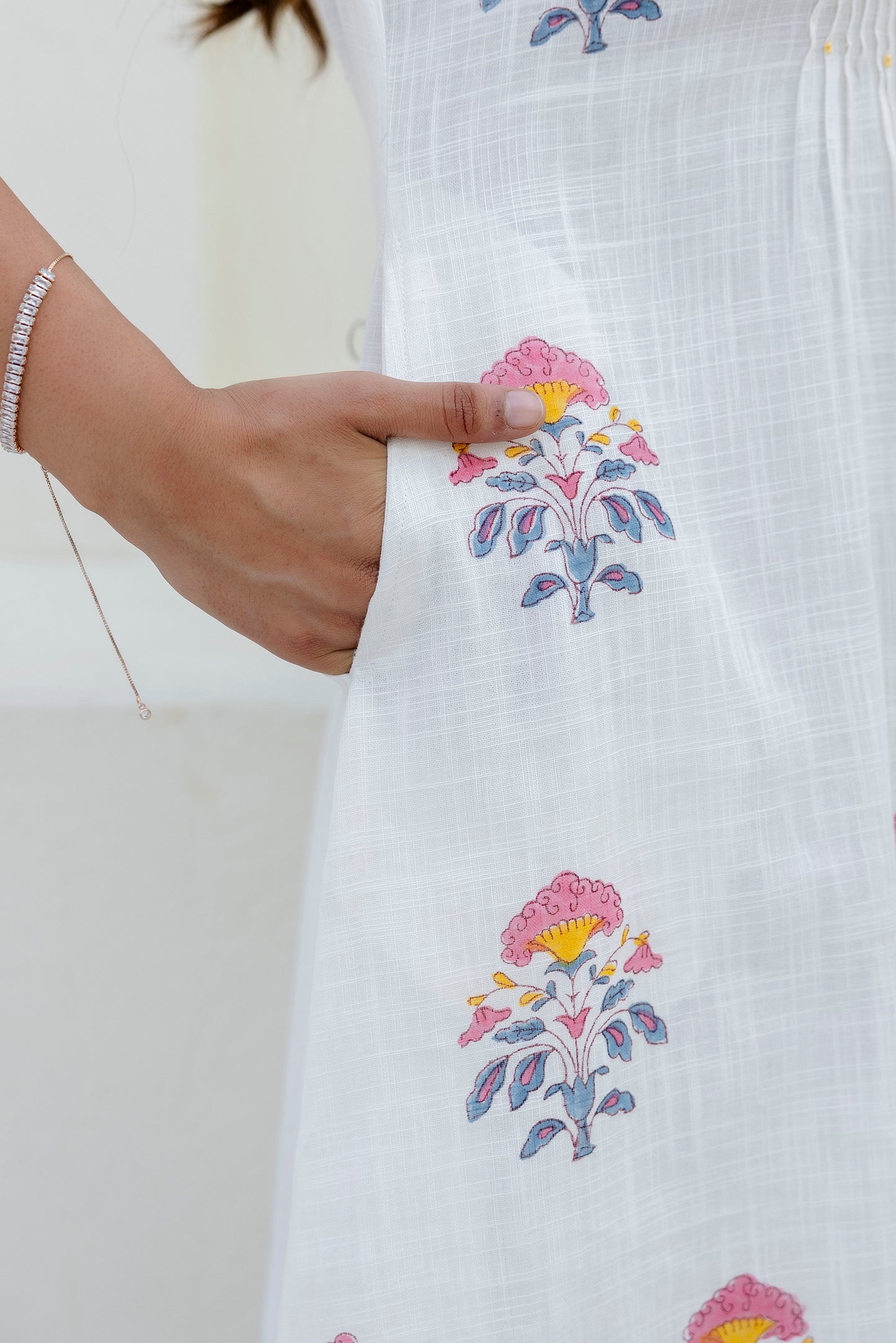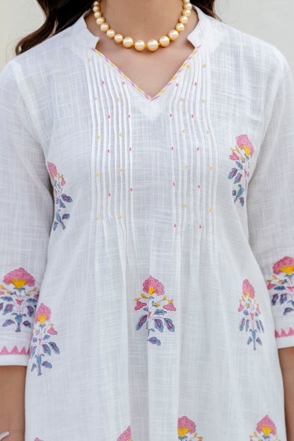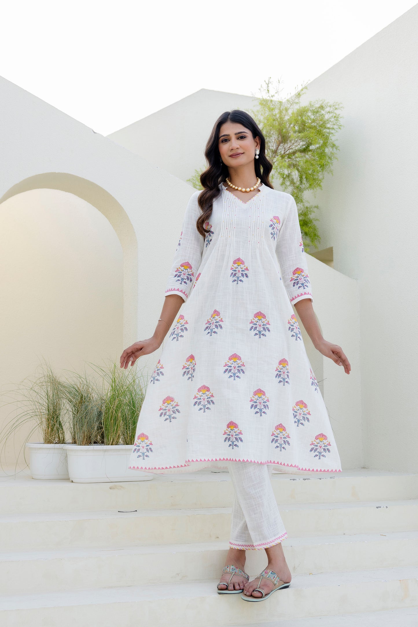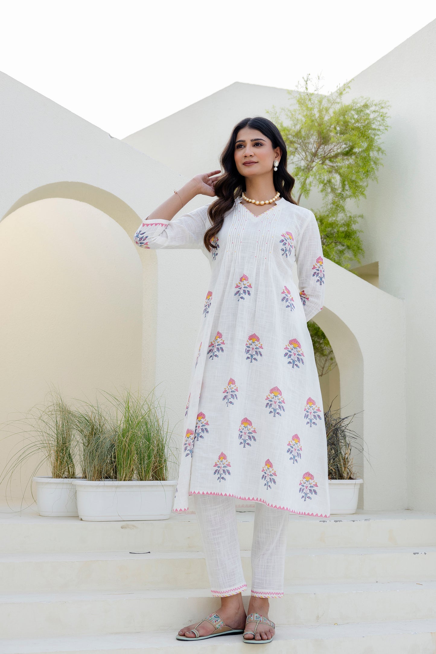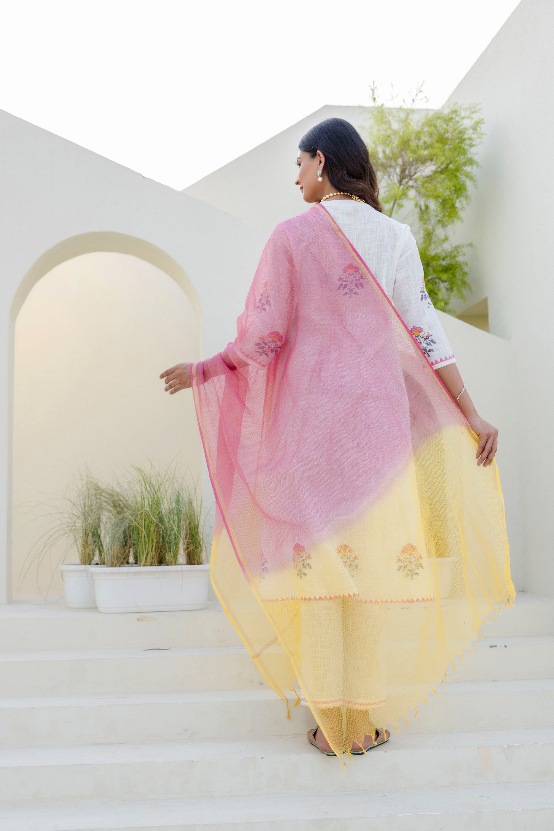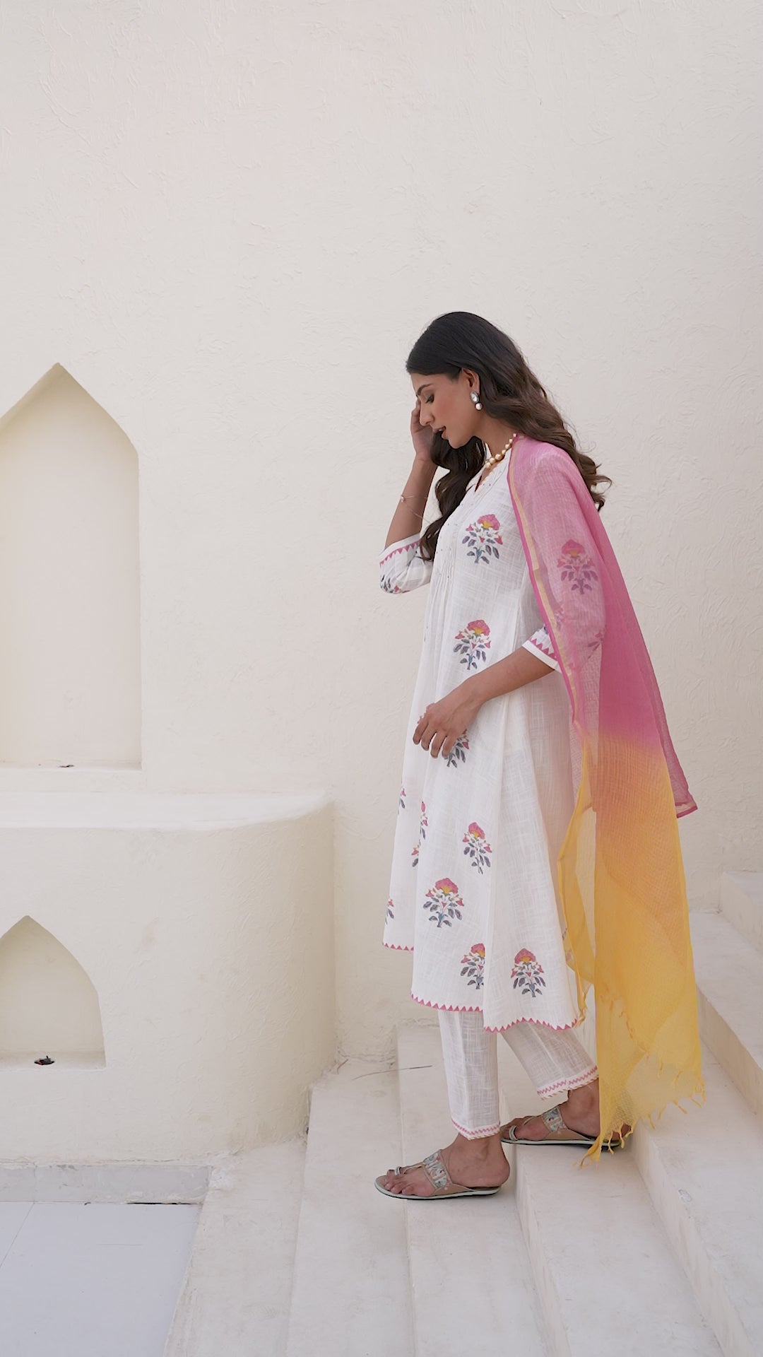 White Slub Cotton Handblock Print Kurta Pant Dupatta